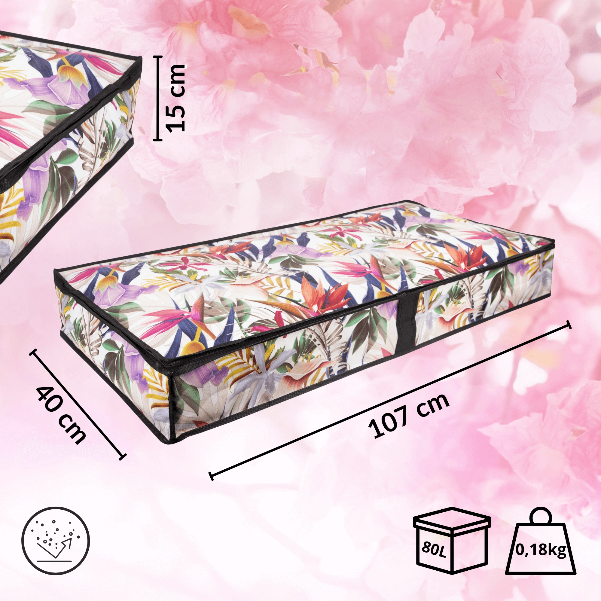 Elegante textiele opbergbox met bloemmotief, ideaal voor het opbergen van kleding, dekens en beddengoed. Dankzij de rits rondom en het zijhandvat heb je overal snel toegang, terwijl het stevige non-woven PET-materiaal de inhoud tegen stof beschermt en helpt ruimte onder het bed te besparen of in de kledingkast.