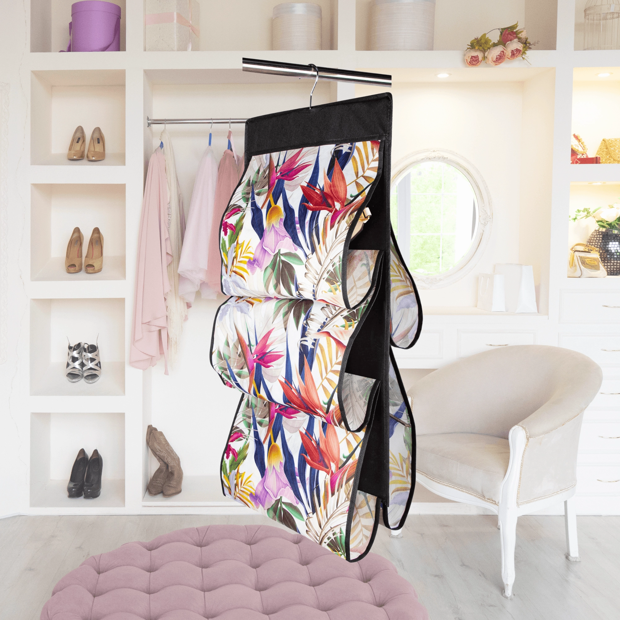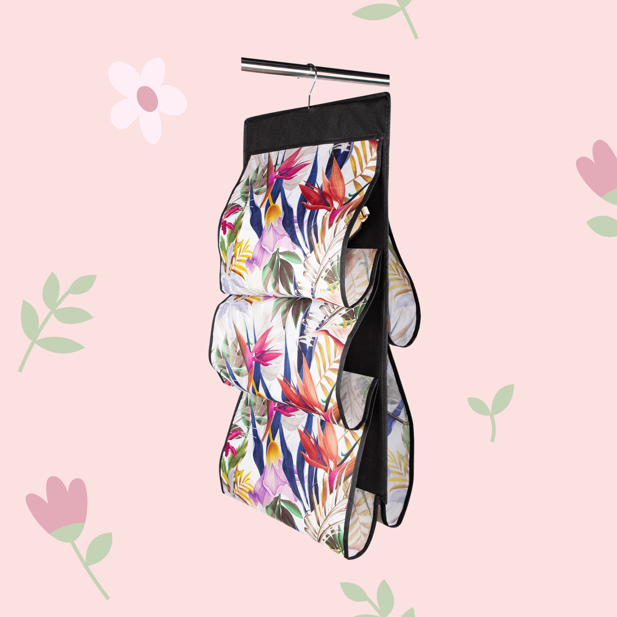 De hangende organizer FLORAL is een slimme oplossing voor verticale opslag van handtassen en accessoires. Dankzij de vijf overzichtelijke vakken heb je alles binnen handbereik en blijft je kast georganiseerd. De luchtige en duurzame non-woven PET-stof beschermt tegen stof en slijtage, is licht van gewicht en gemakkelijk te onderhouden.