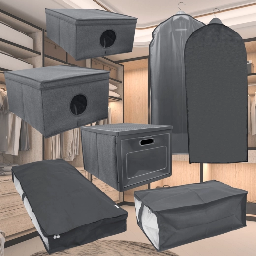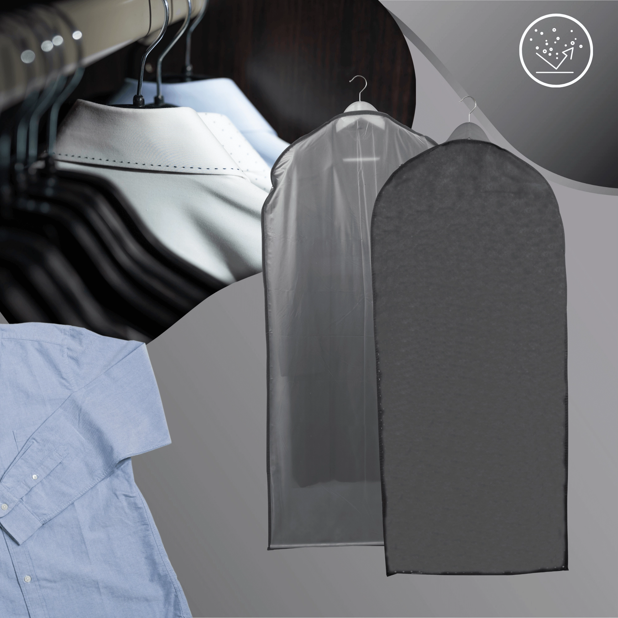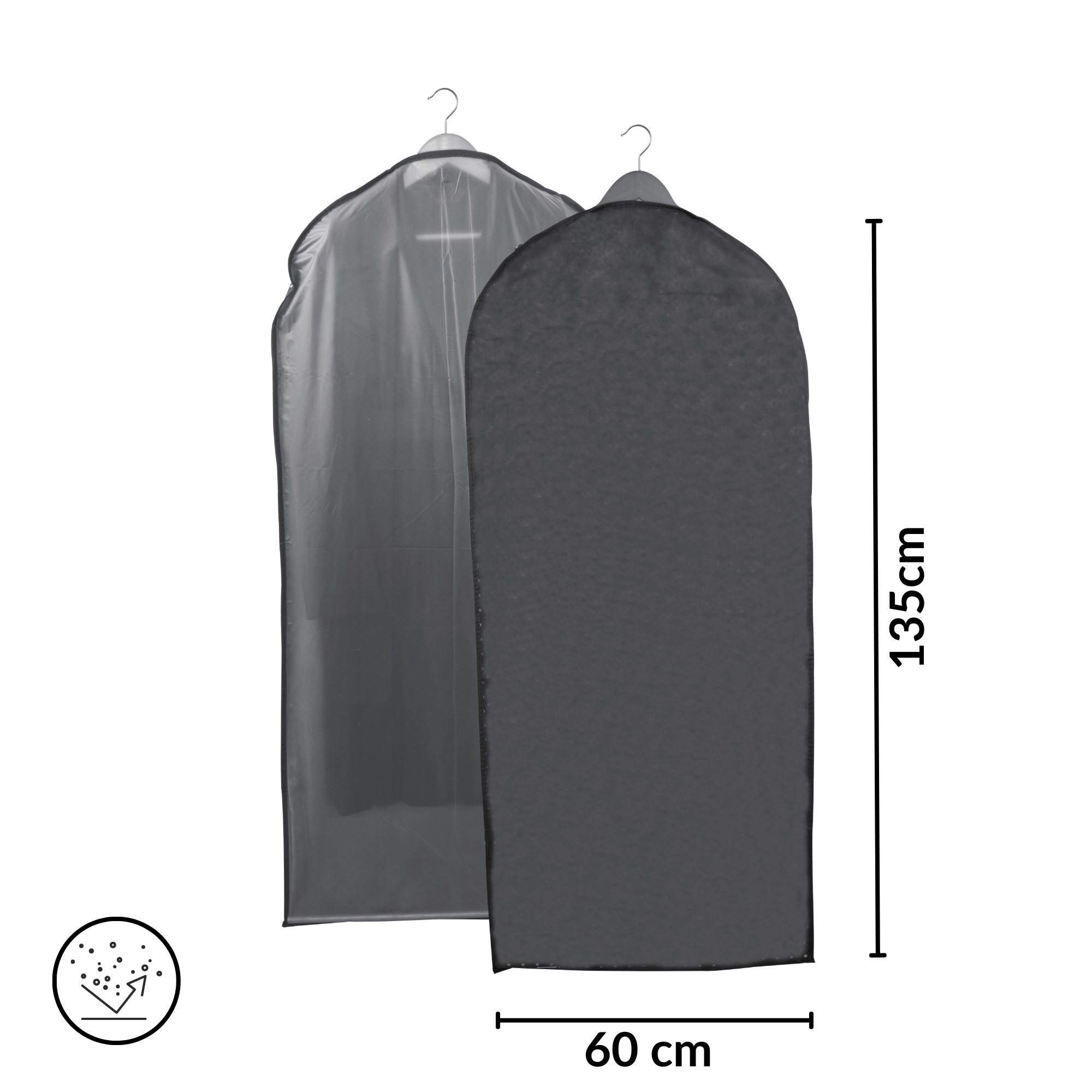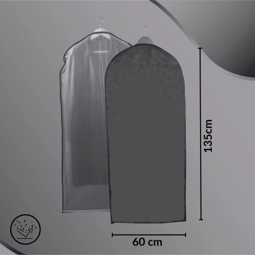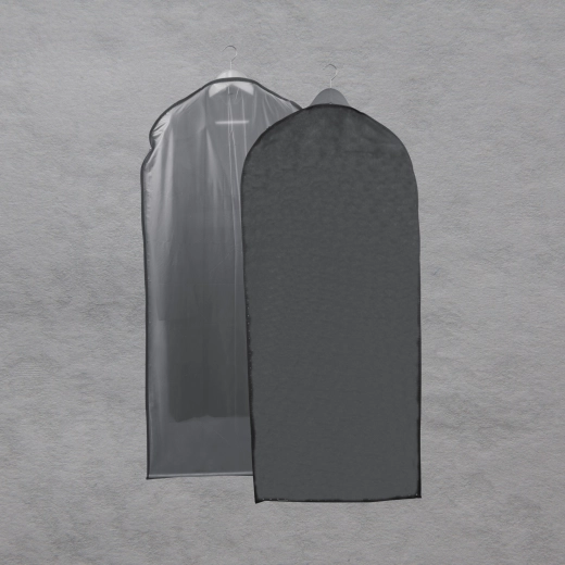 Houd je jurken, jassen en overhemden als nieuw met de praktische kledinghoes GREY. Voorzijde met transparant paneel voor snel overzicht, achterzijde in elegant grijs voor een opgeruimde kastlook, en een rits over de volledige lengte voor eenvoudig openen. De lichte geweven PET-non-woven stof beschermt betrouwbaar tegen stof en vuil.