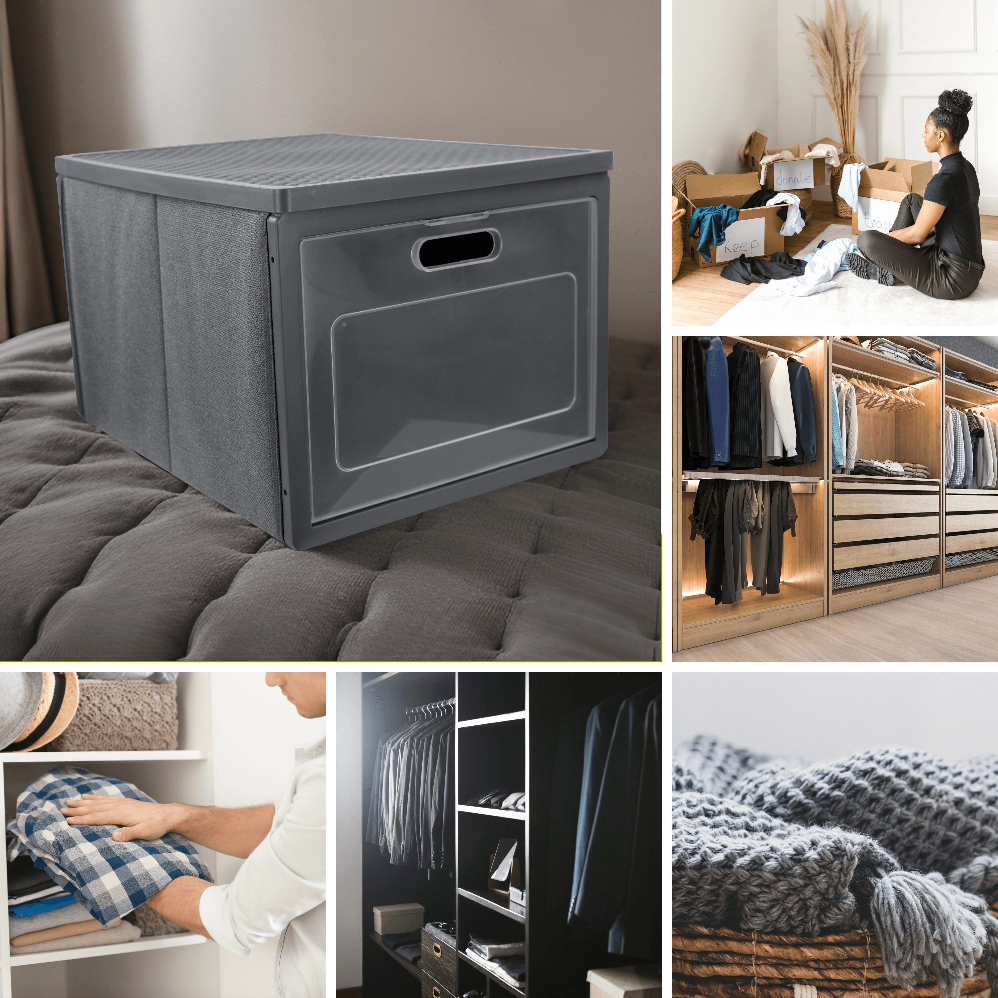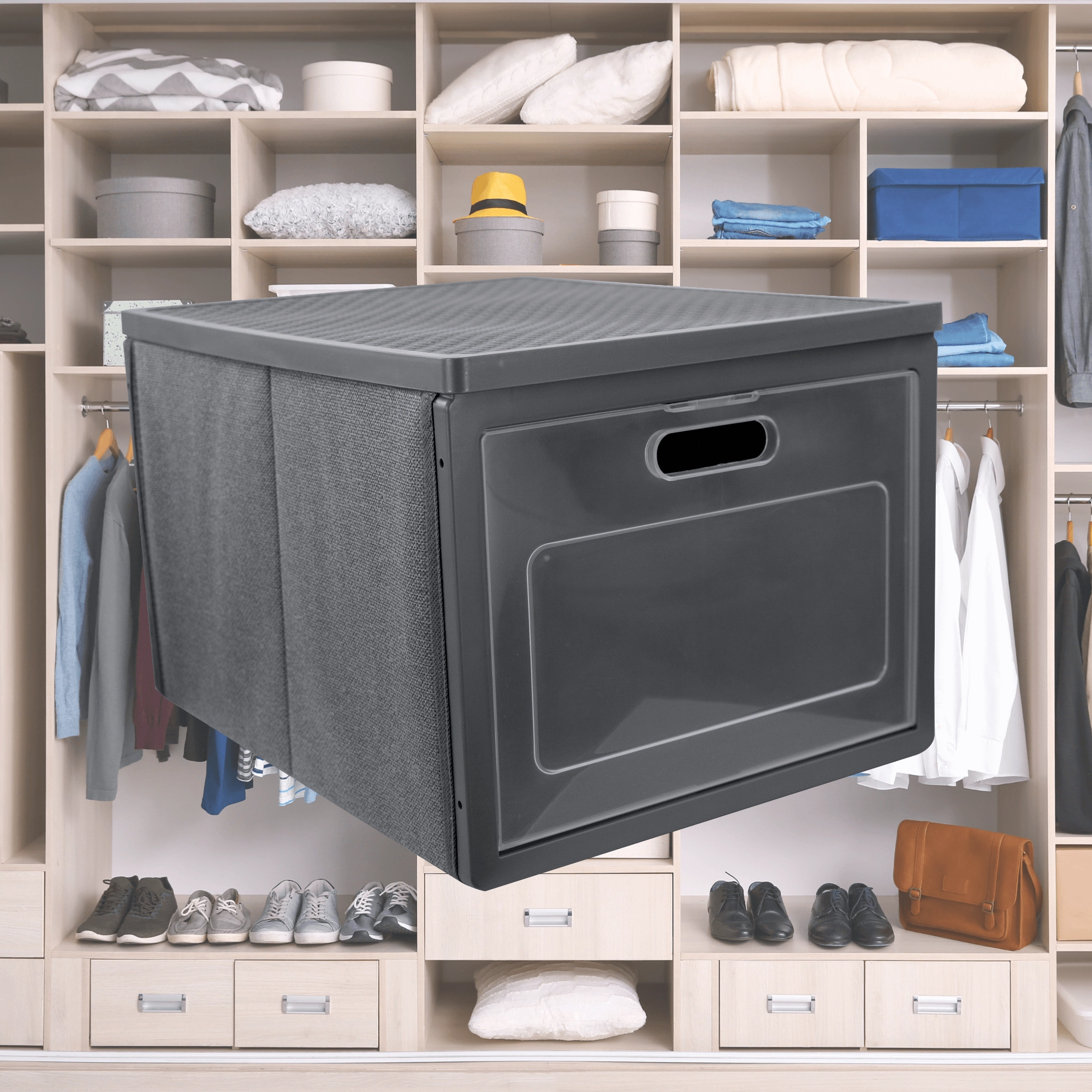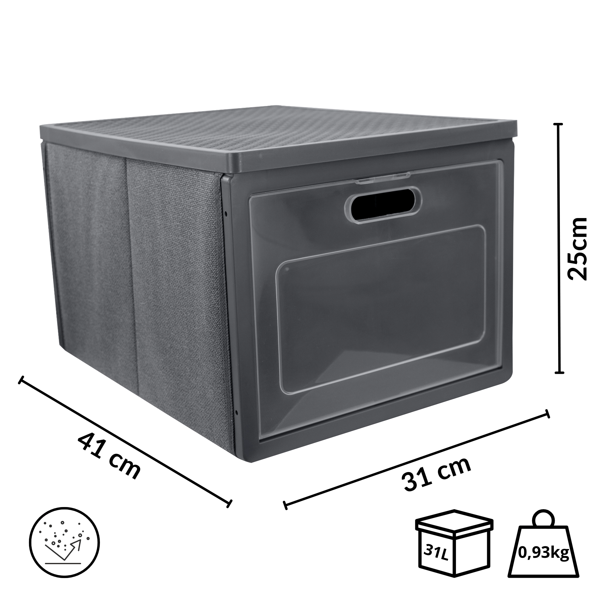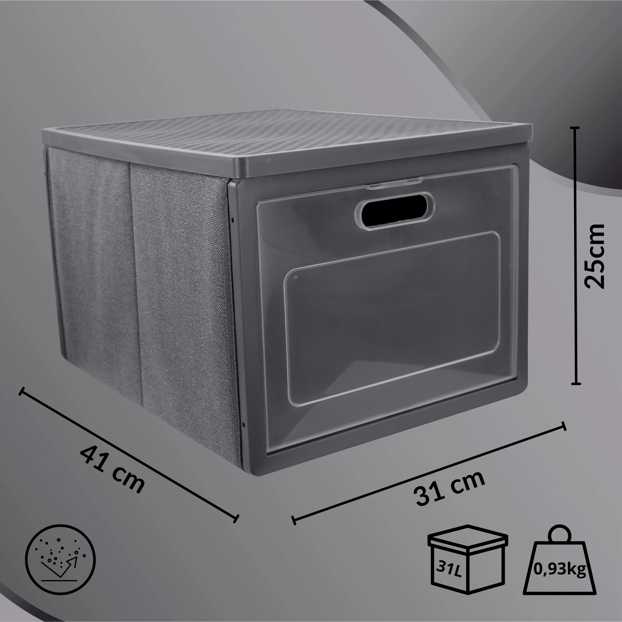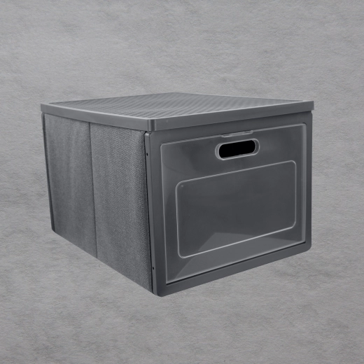 De grijze kastorganizer met voordeuren is ideaal voor het opbergen van kleding, linnengoed, accessoires, documenten en kinderspeelgoed. Het stevige metalen frame en de dubbele bodem behouden de vorm zelfs bij hogere belasting, terwijl de opening aan de voorkant toegang geeft zonder de box te hoeven verplaatsen.