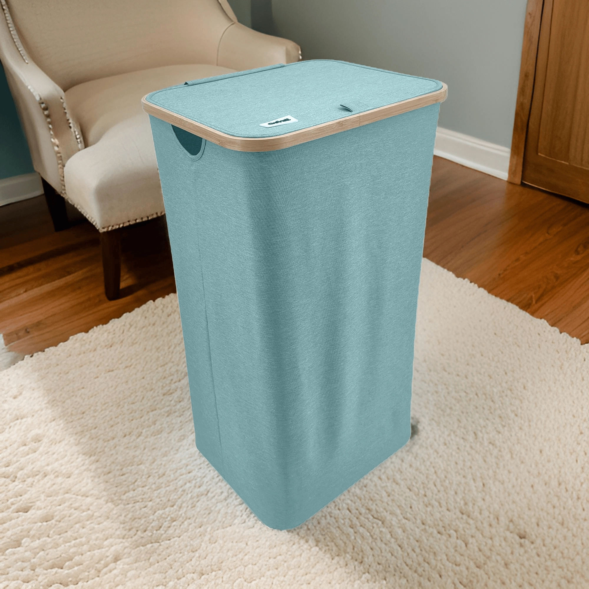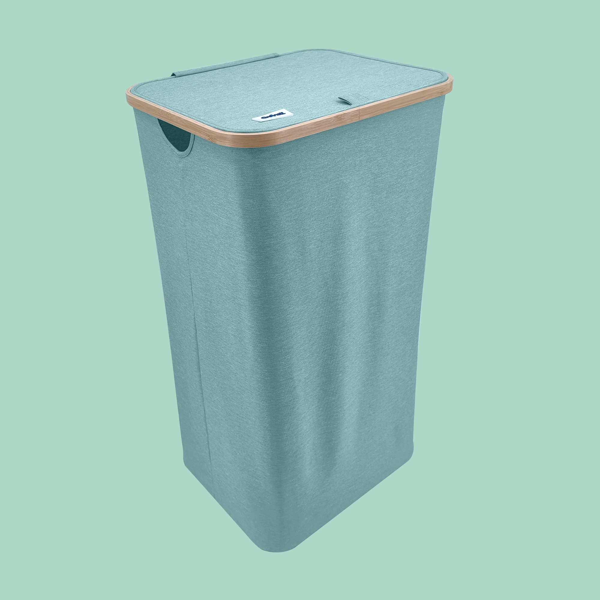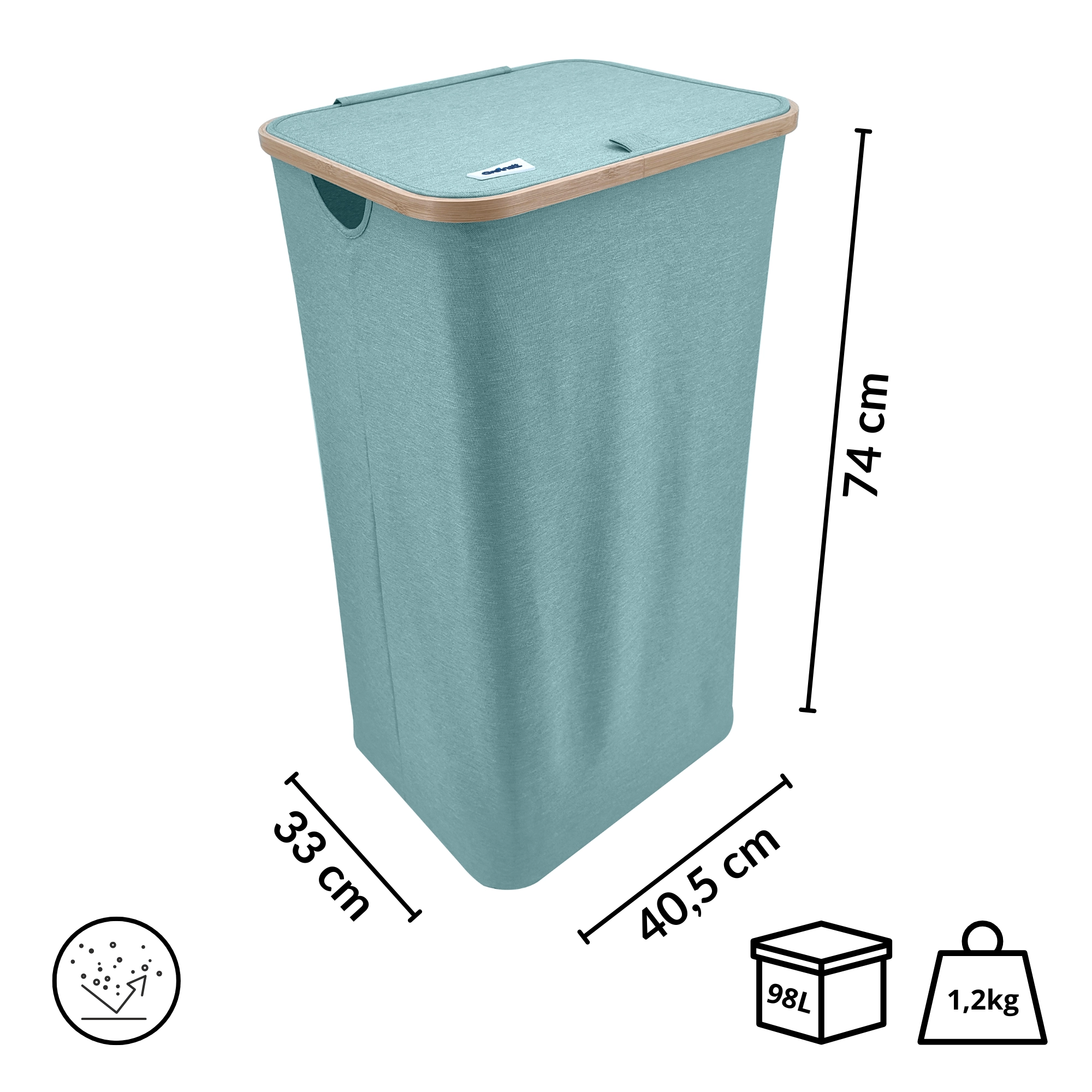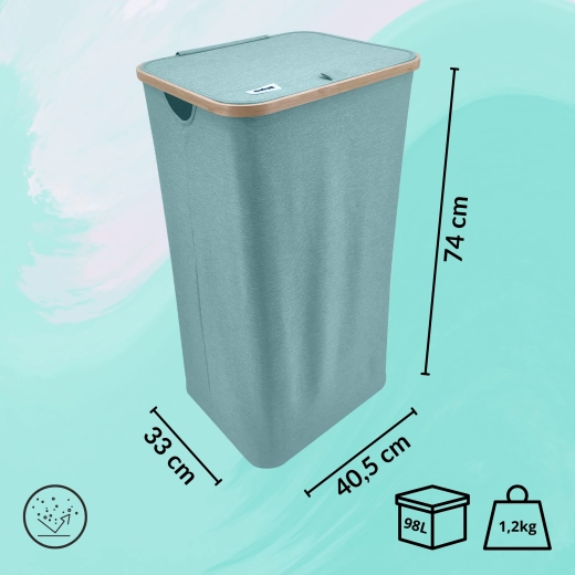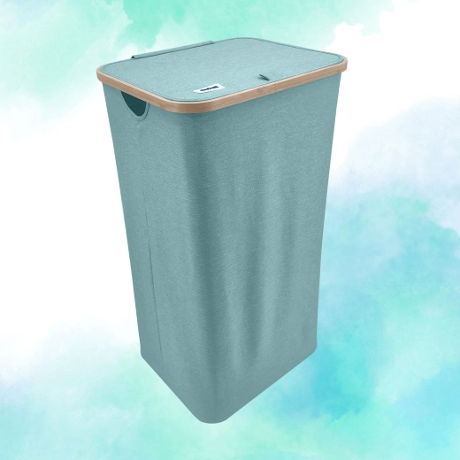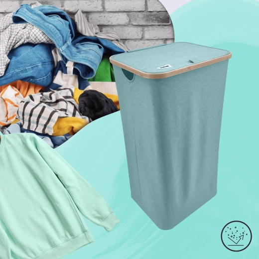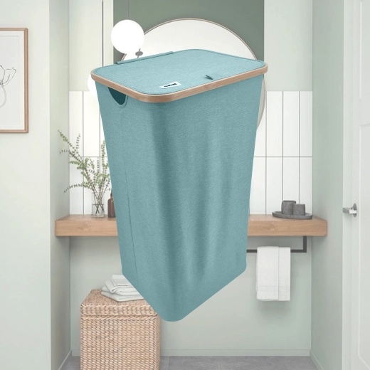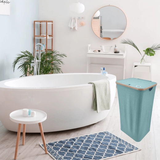 Houd je huis overzichtelijk en stijlvol. Deze hoge wasmand met een bamboerand valt op door zijn moderne look en praktische details. De lichte maar stabiele textiele behuizing van duurzaam polyester is ademend zodat wasgoed niet muf wordt, en het deksel verbergt de inhoud en geuren discreet.