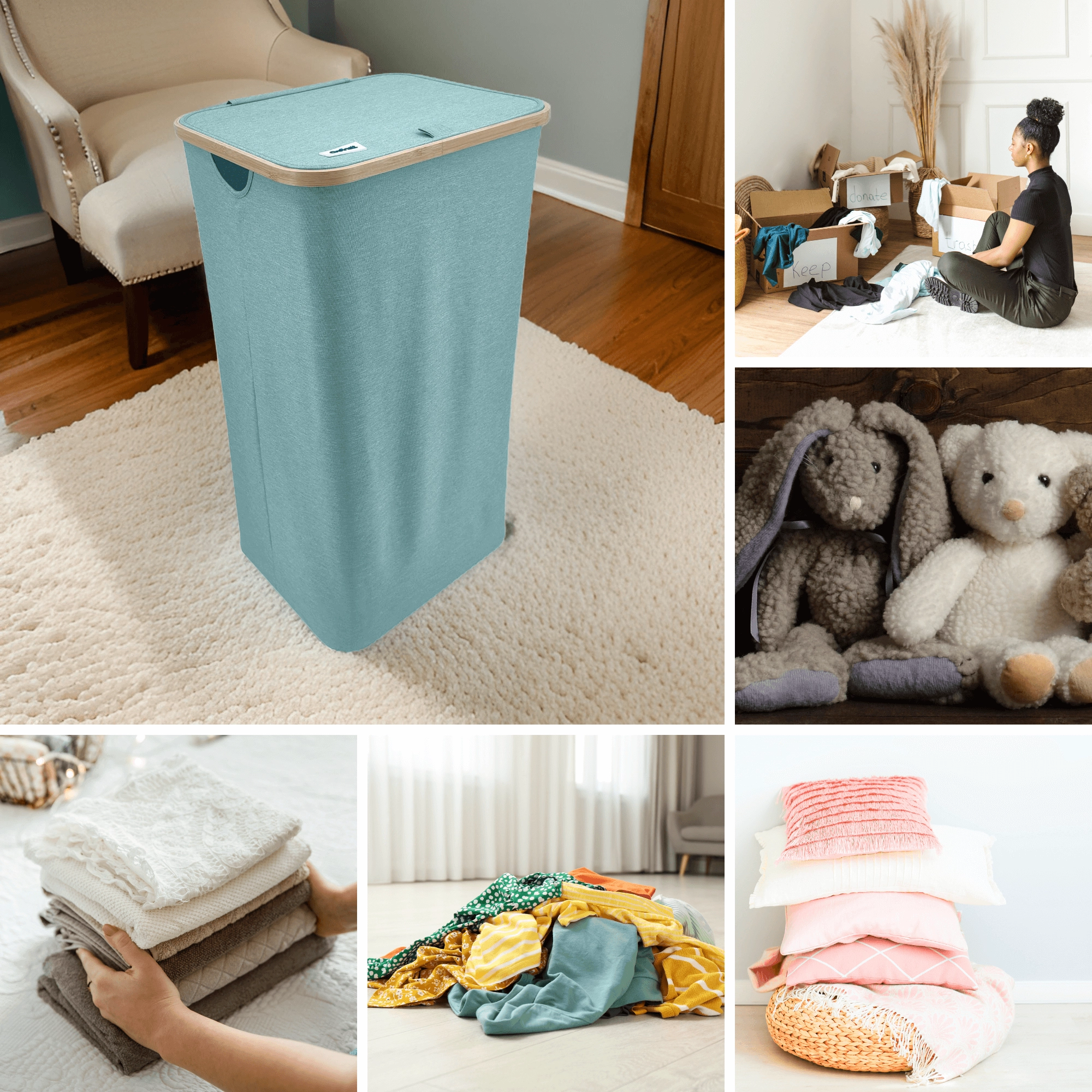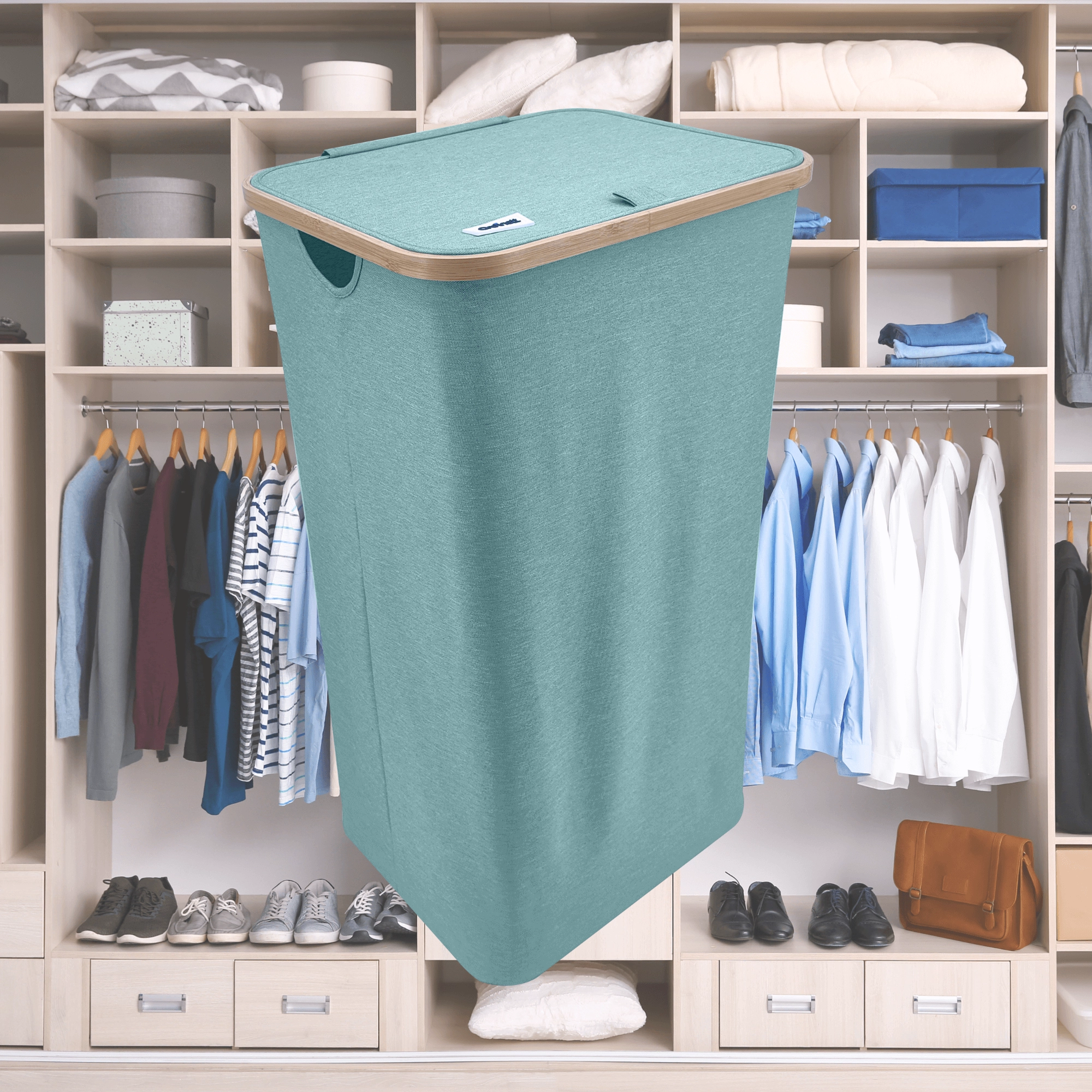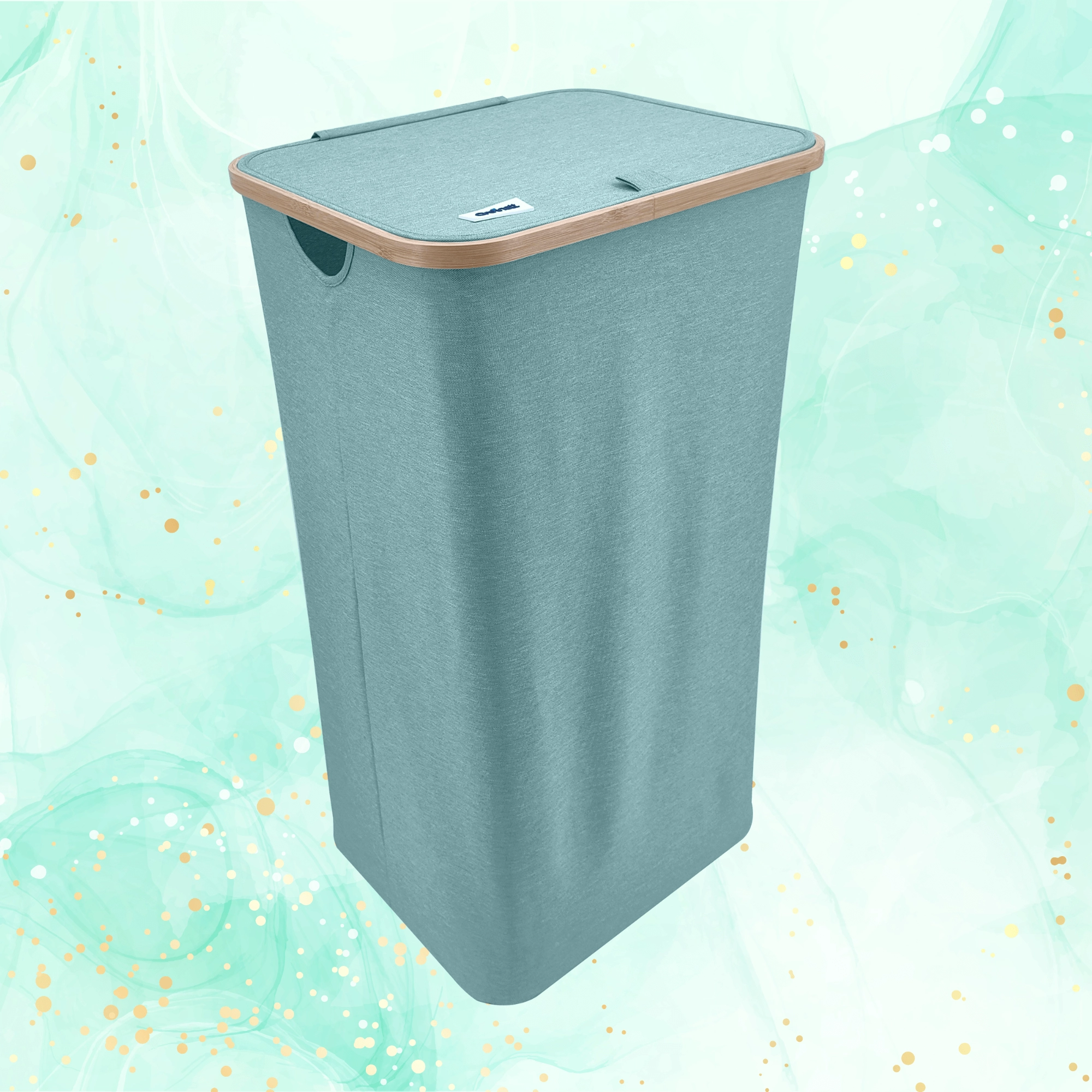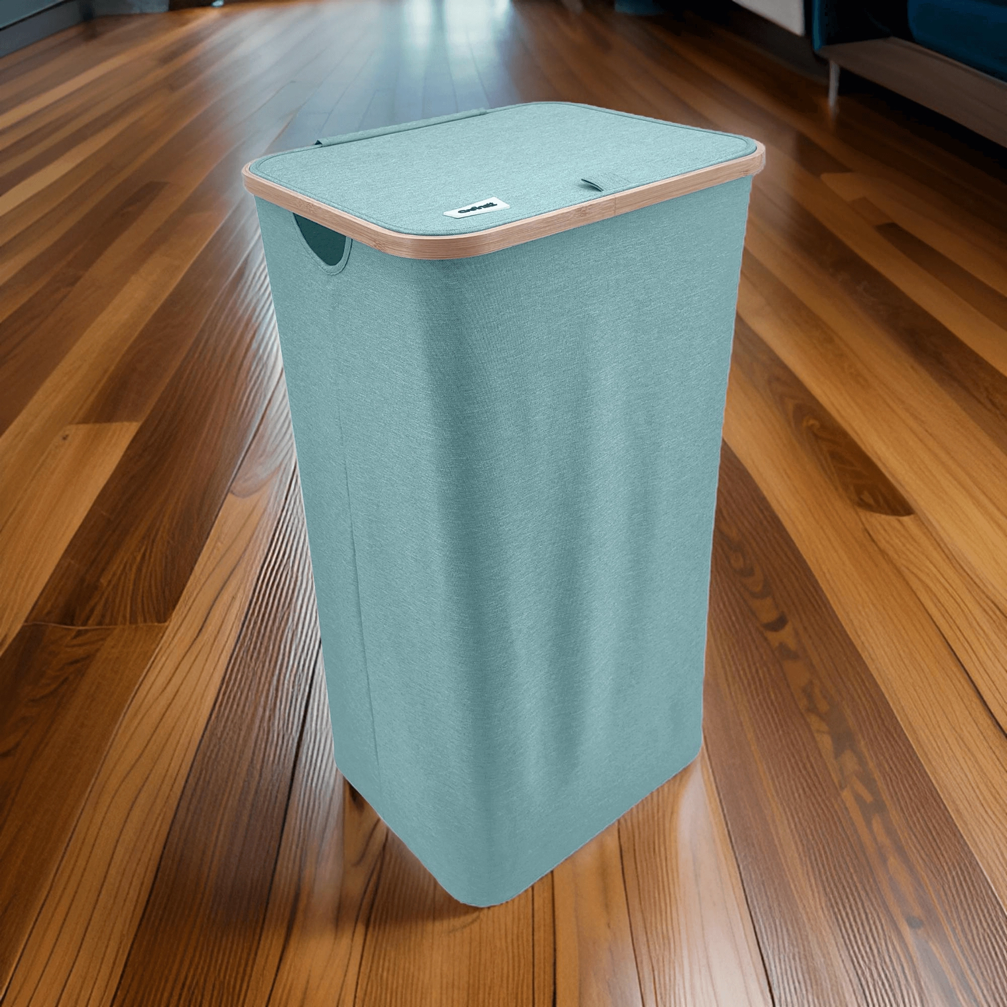 Houd je huis overzichtelijk en stijlvol. Deze hoge wasmand met een bamboerand valt op door zijn moderne look en praktische details. De lichte maar stabiele textiele behuizing van duurzaam polyester is ademend zodat wasgoed niet muf wordt, en het deksel verbergt de inhoud en geuren discreet.