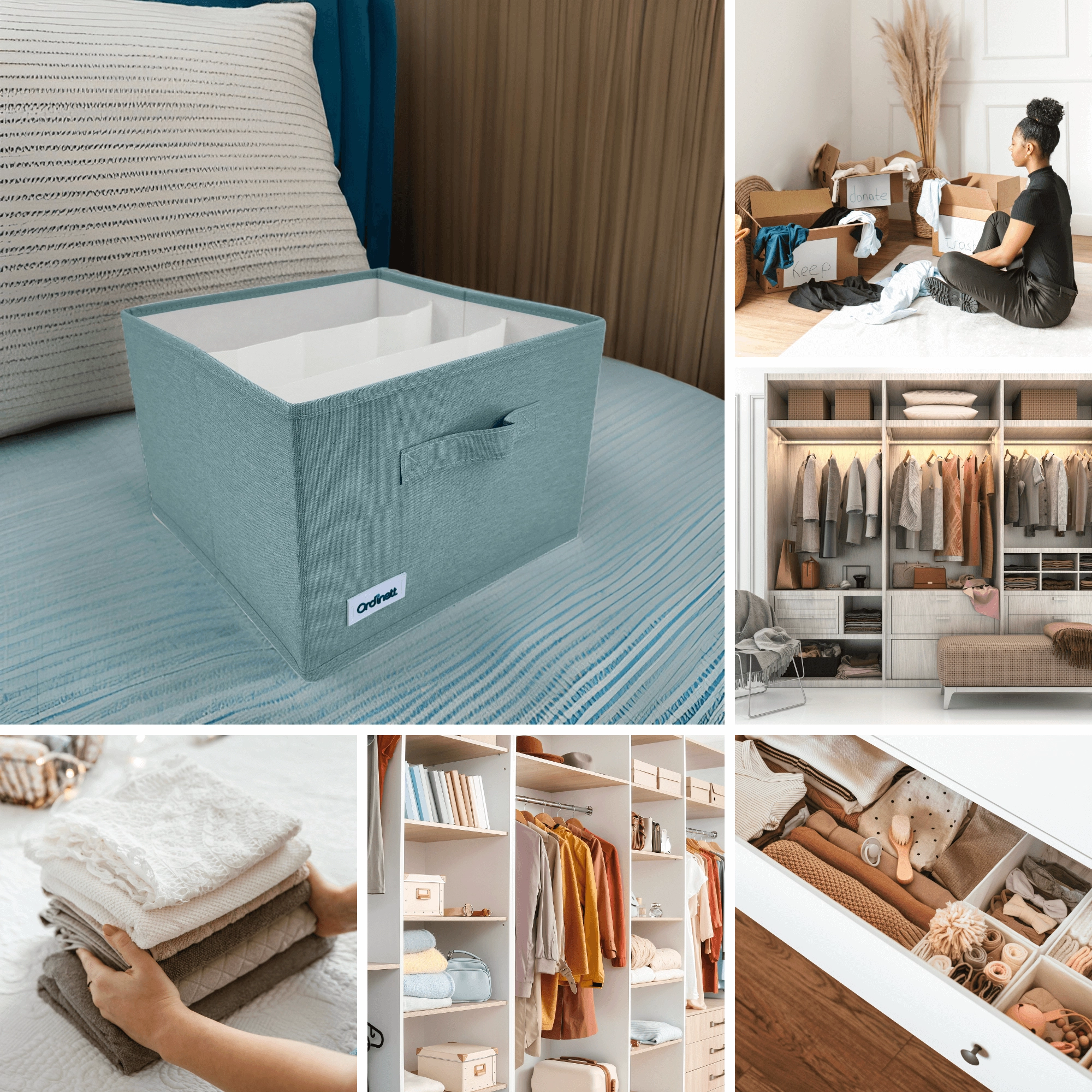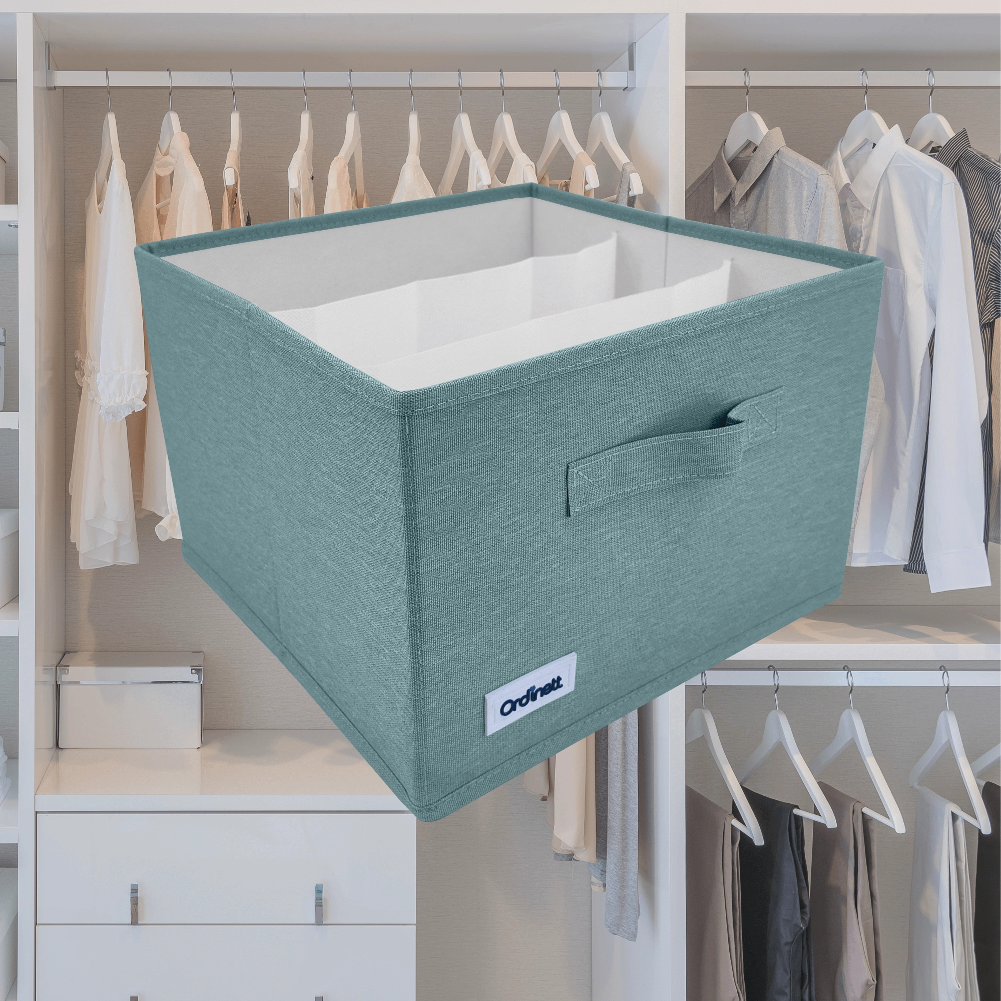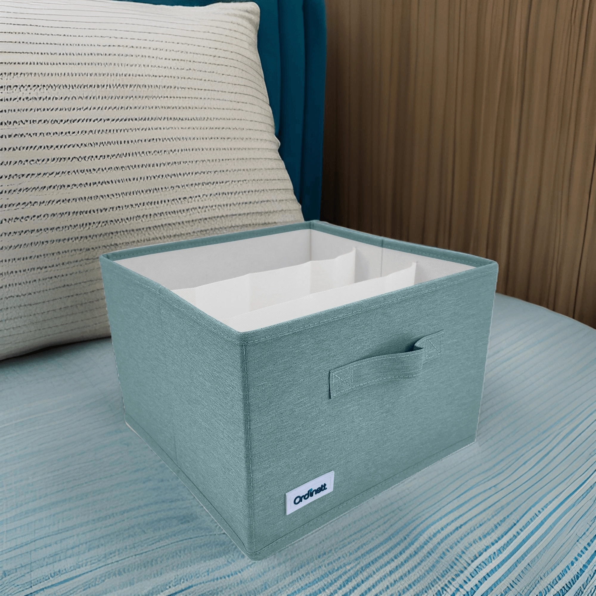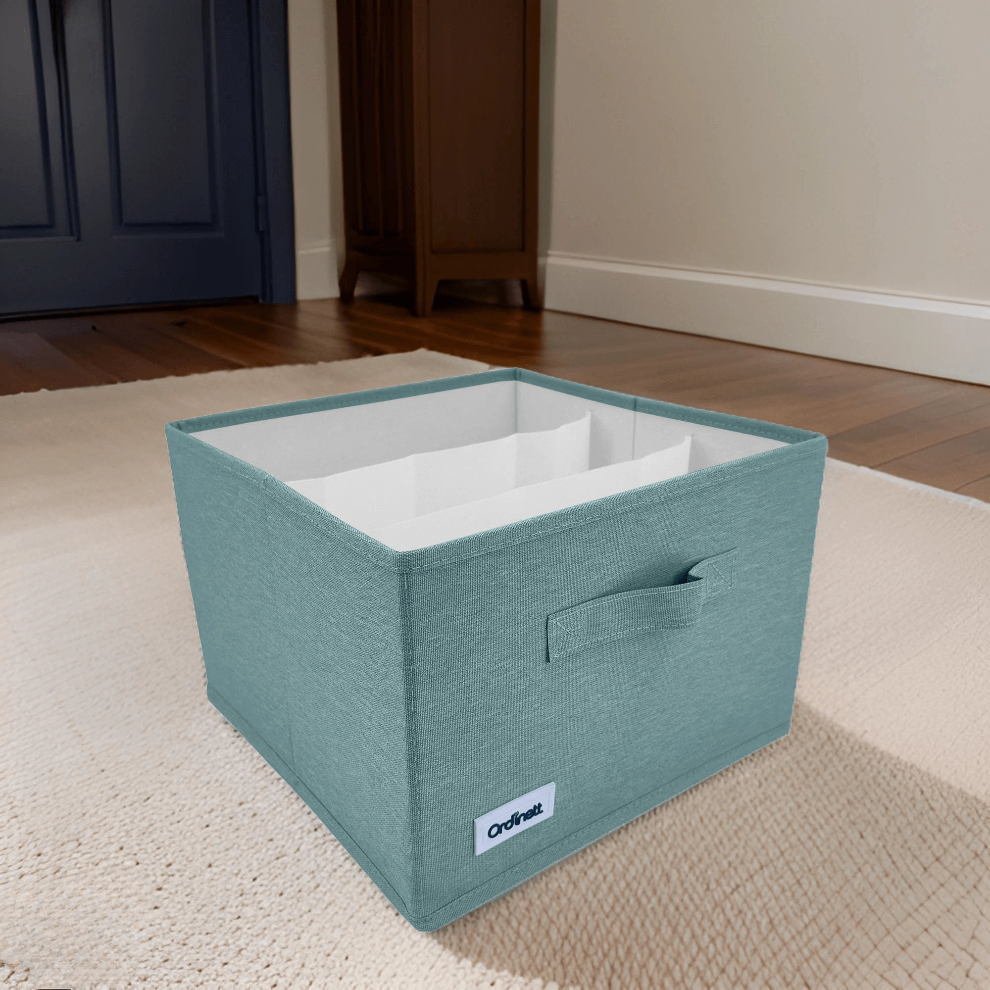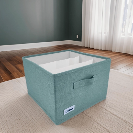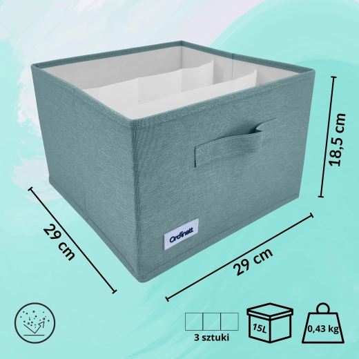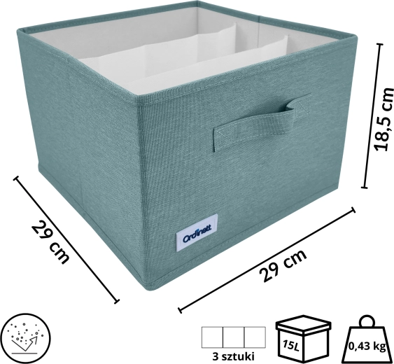 Houd je kast perfect opgeruimd met deze mintkleurige textiele organizer. Dankzij de overzichtelijke vakken, de voorste greep en de opvouwbare constructie sorteer je gemakkelijk wasgoed, accessoires of kinderspeelgoed. De stevige uitvoering van duurzame polyester en het universele formaat 29 × 29 × 18,5 cm passen in planken, rekken en garderobesystemen.