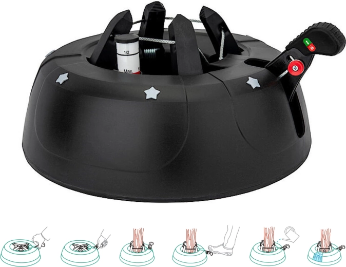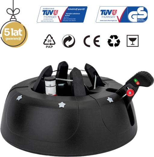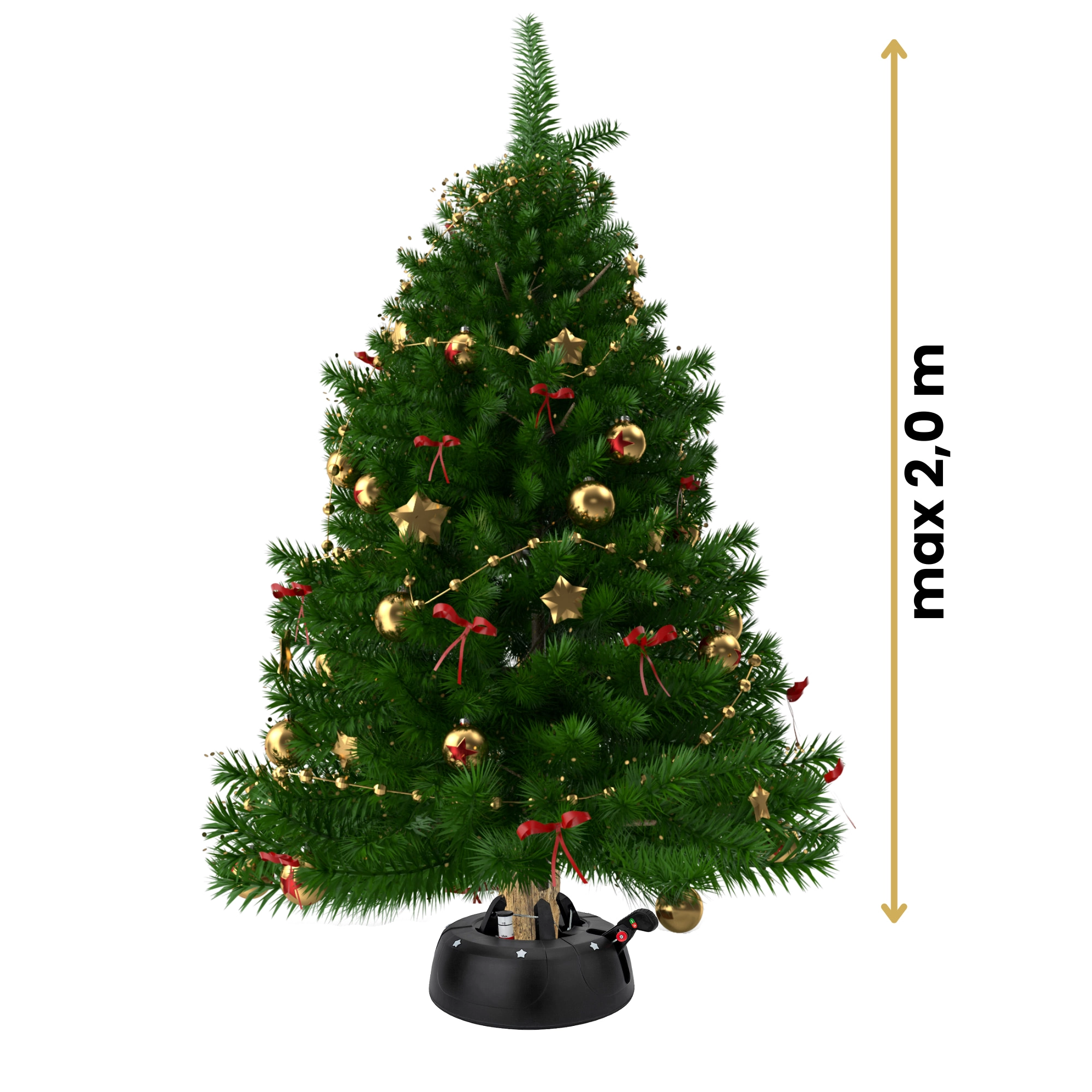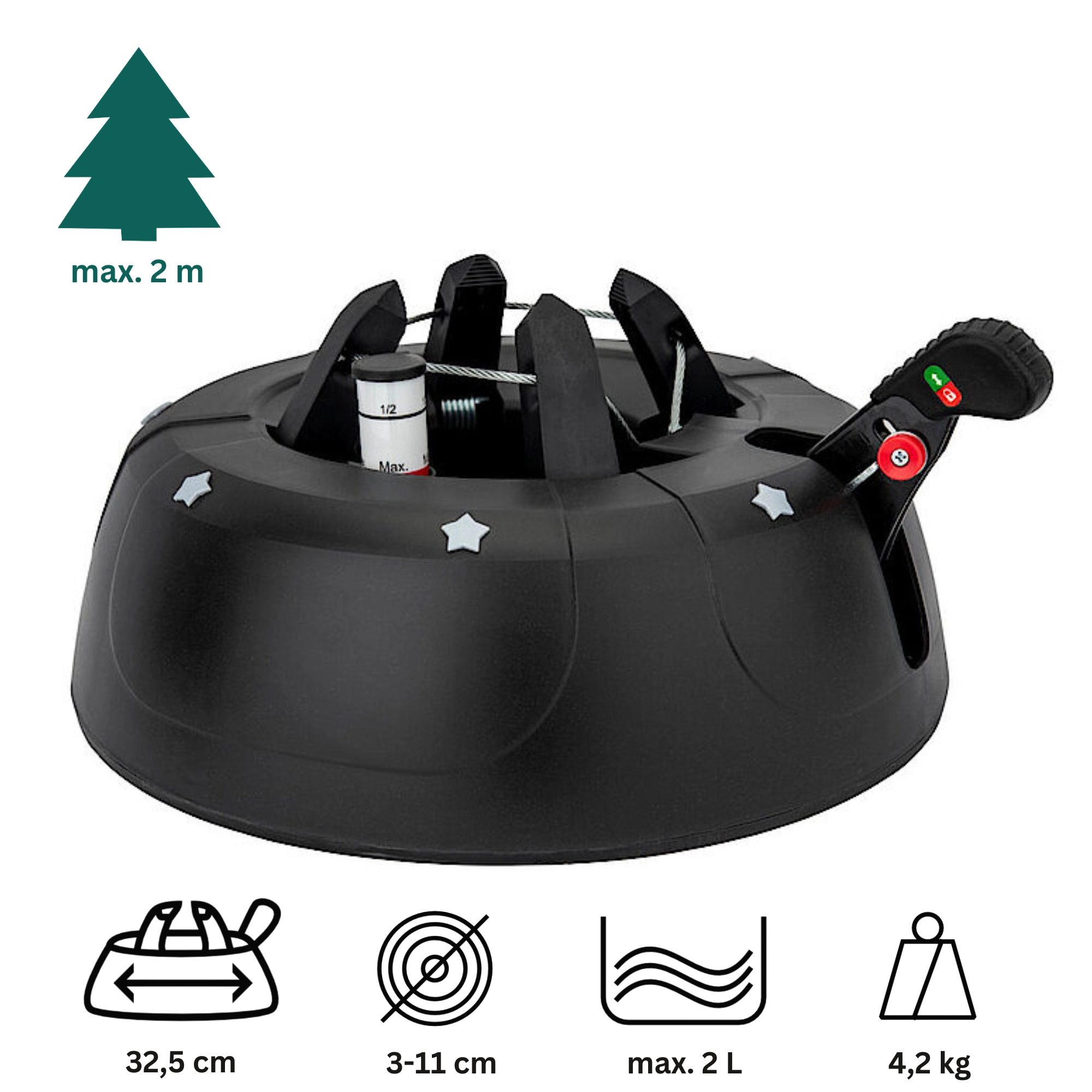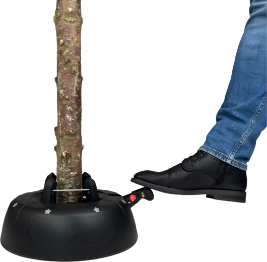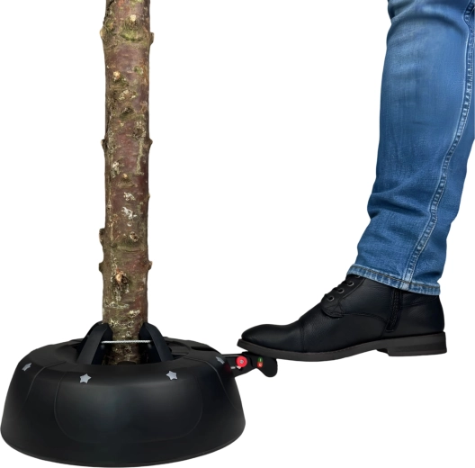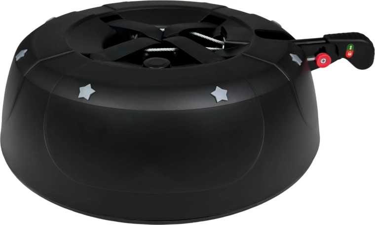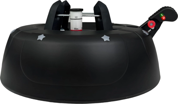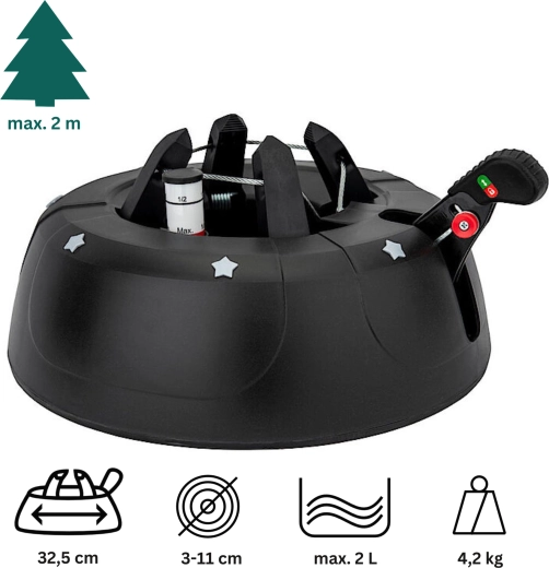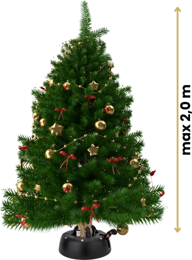 De brede en zware basis (4,2 kg, diameter 34 cm) zorgt voor een stevige verankering van bomen tot 2 m en voor comfortabel gebruik tijdens de feestdagen.