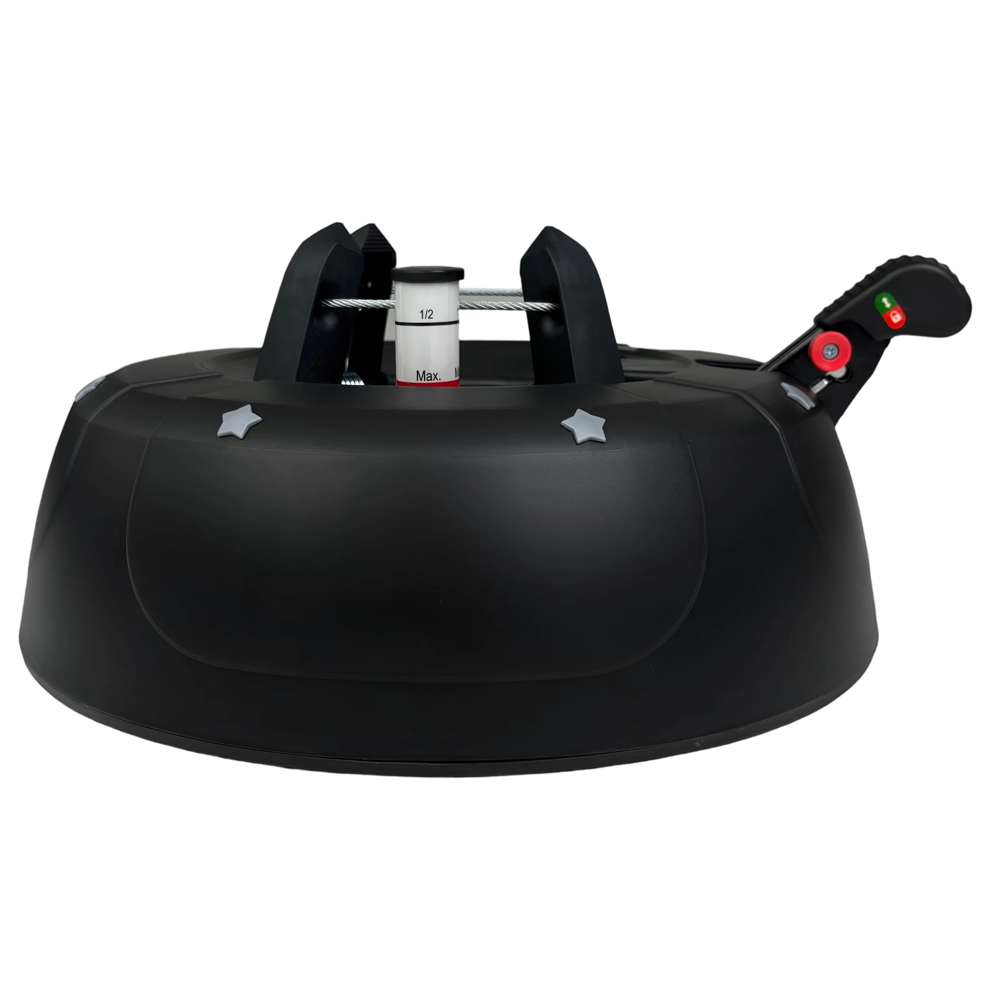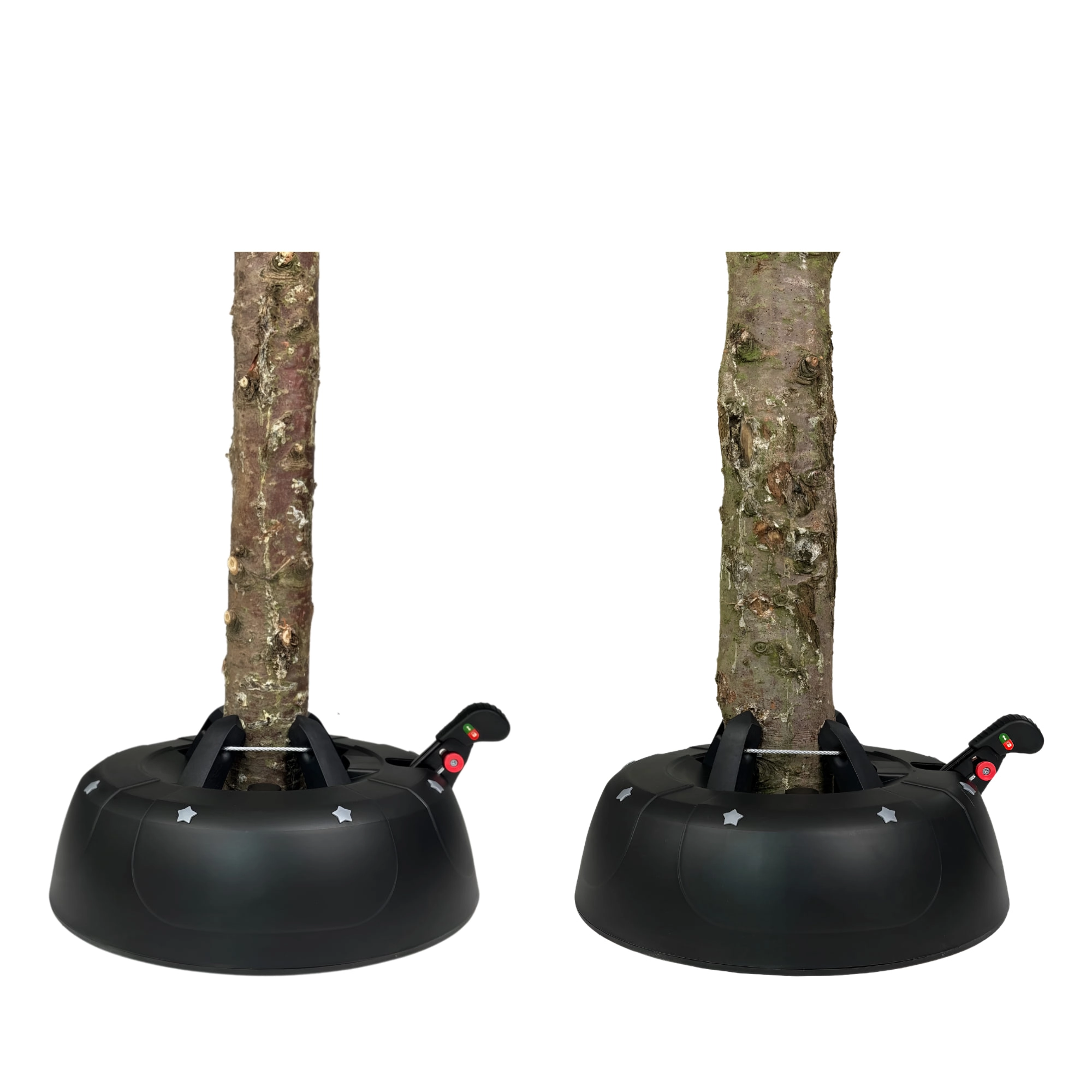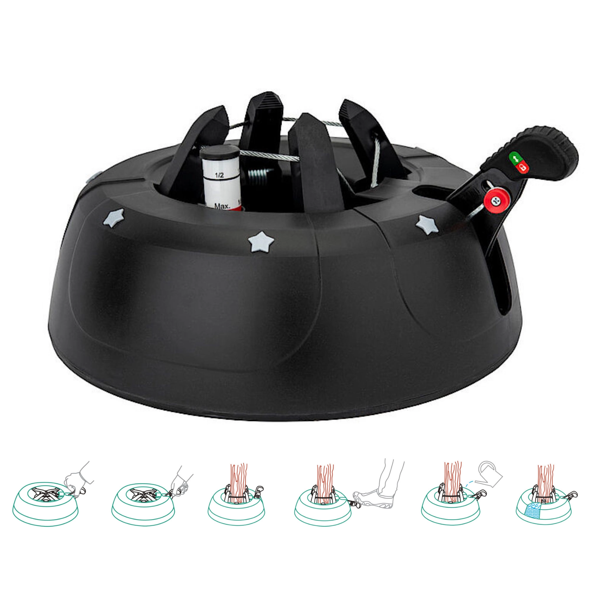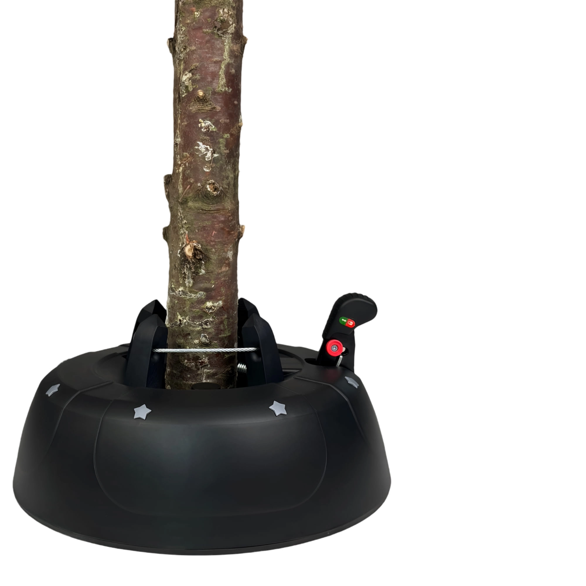 De brede en zware basis (4,2 kg, diameter 34 cm) zorgt voor een stevige verankering van bomen tot 2 m en voor comfortabel gebruik tijdens de feestdagen.