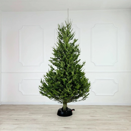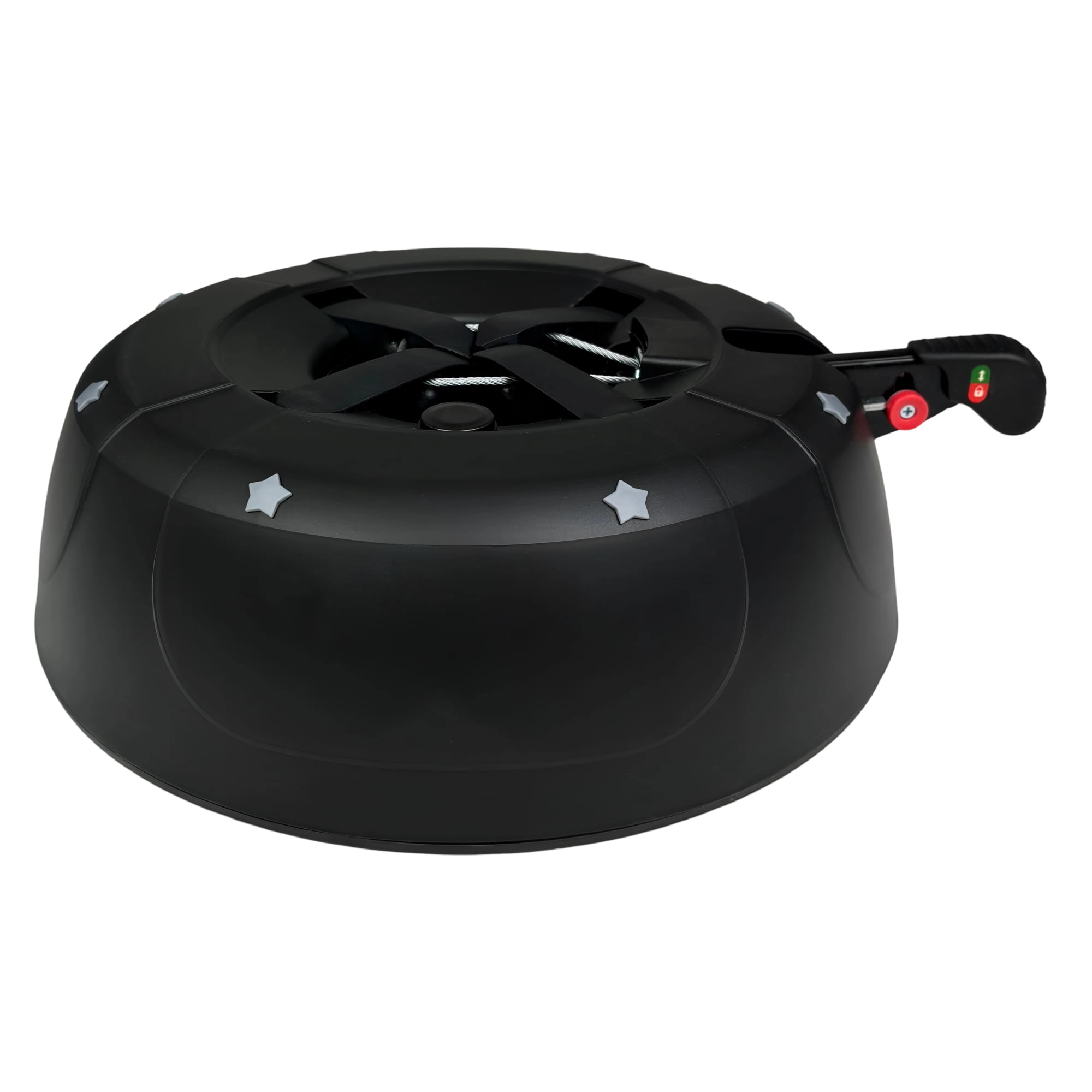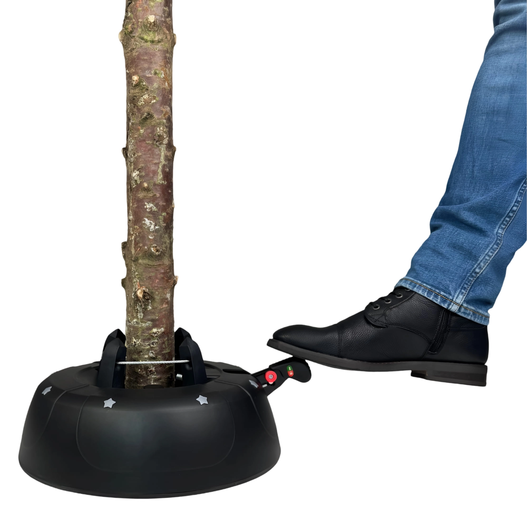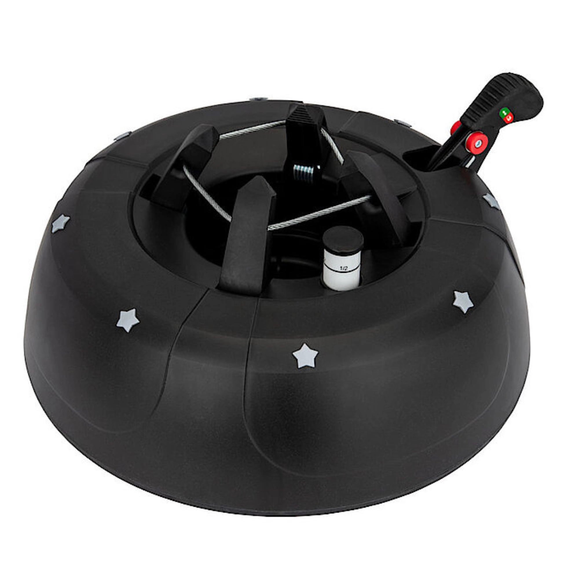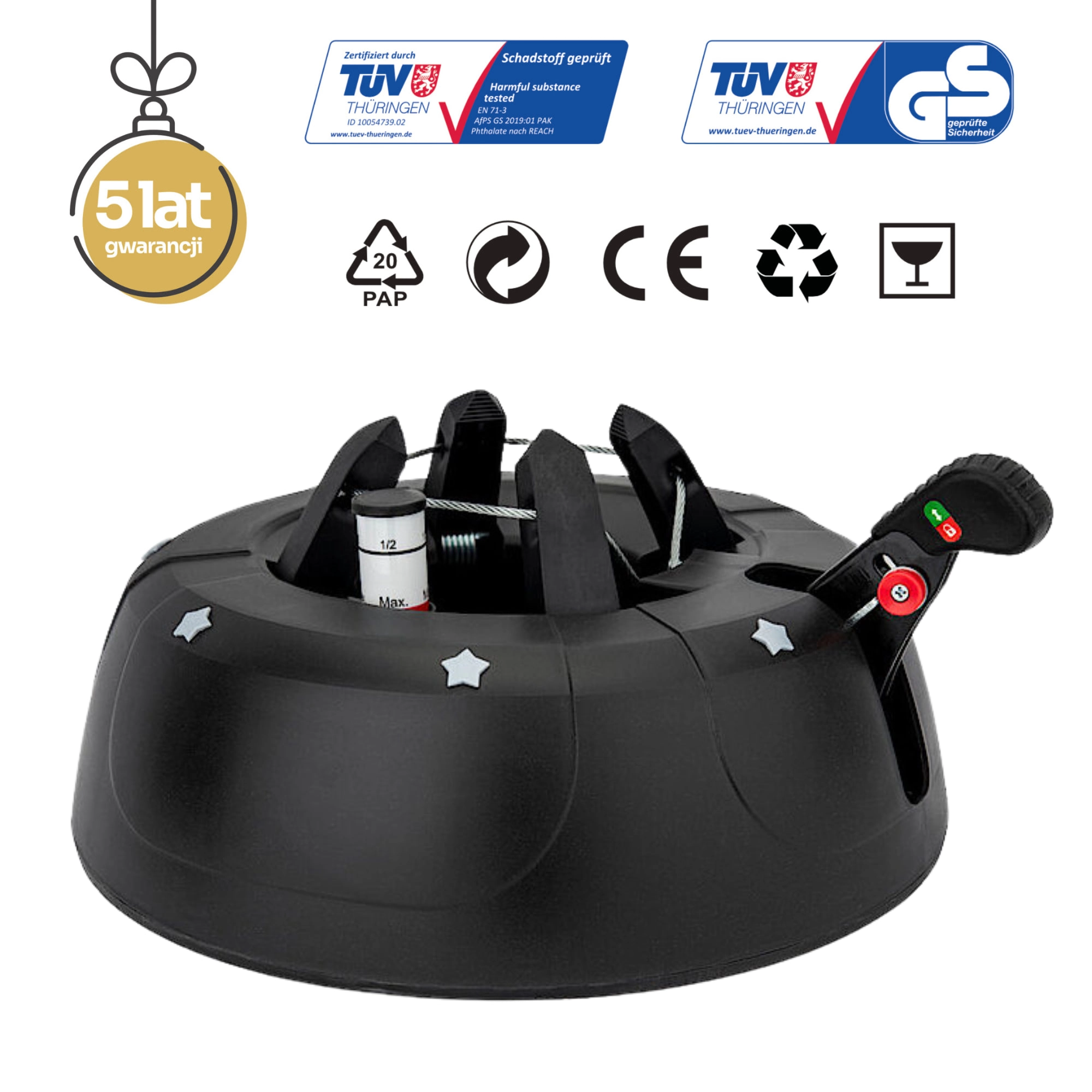 De brede en zware basis (4,2 kg, diameter 34 cm) zorgt voor een stevige verankering van bomen tot 2 m en voor comfortabel gebruik tijdens de feestdagen.