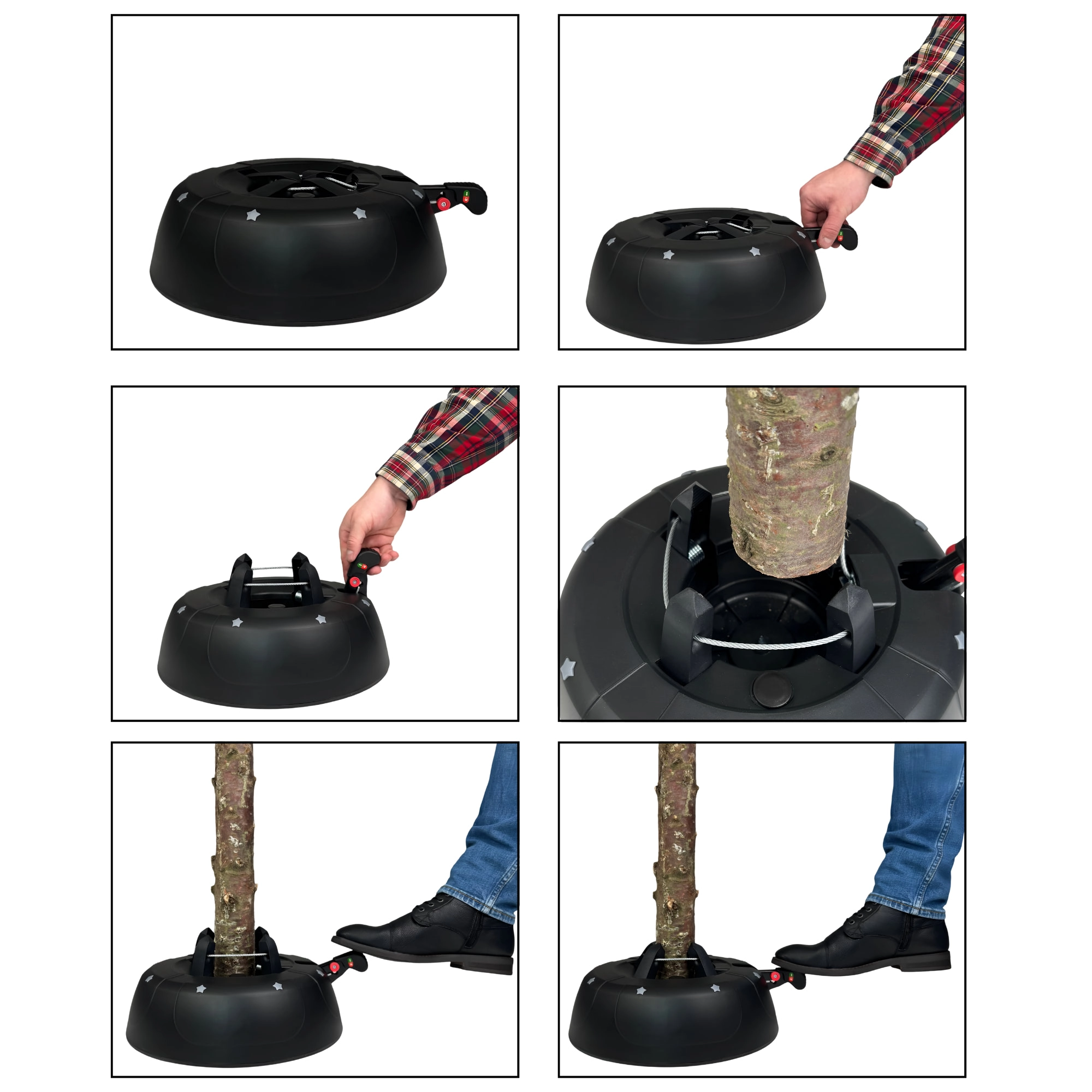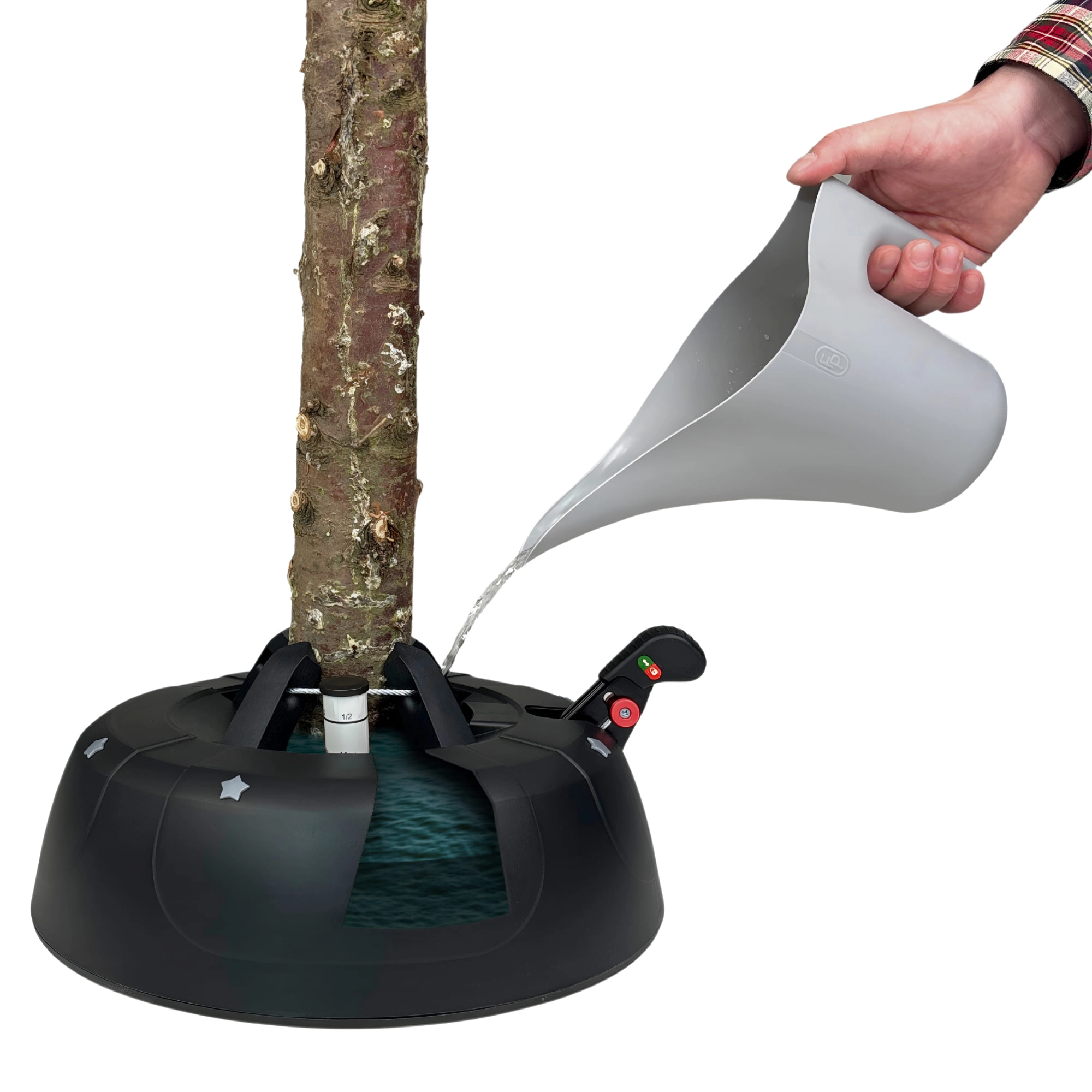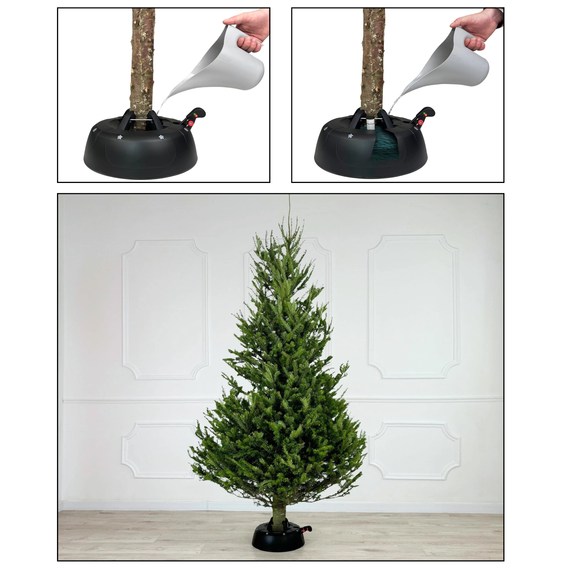 Geniet van zorgeloze feestdagen met een standaard die overal aan denkt – van snel vastzetten van de boom tot het langer vers houden ervan. Het gepatenteerde systeem van vier automatische stalen haken klemt de stam in enkele seconden stevig vast, terwijl de brede en zware basis stabiliteit biedt gedurende de hele kerstperiode.