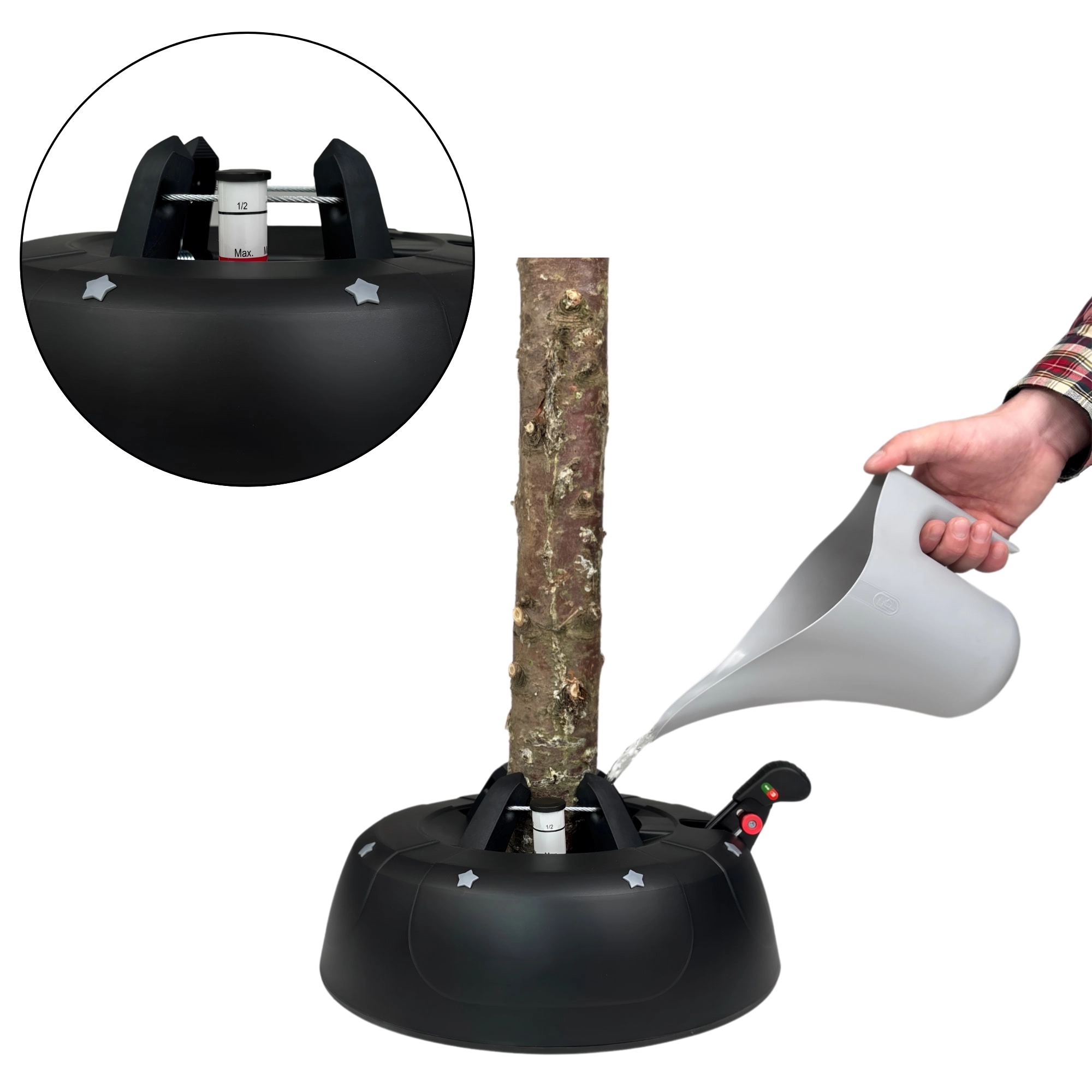 Houd de boom langer vers dankzij het waterreservoir van 2 liter. De peilindicator maakt bijvullen eenvoudig en vermindert naaldval.