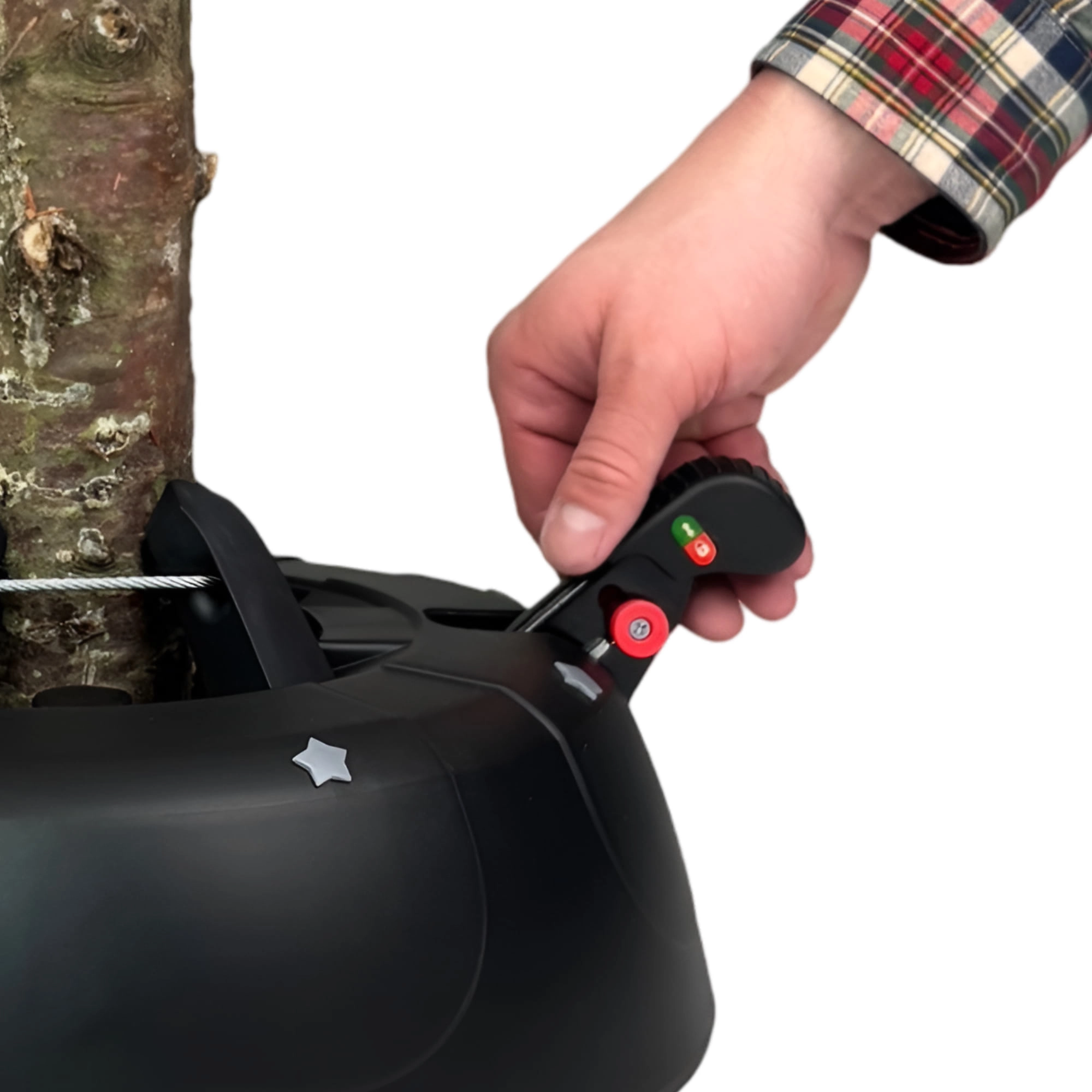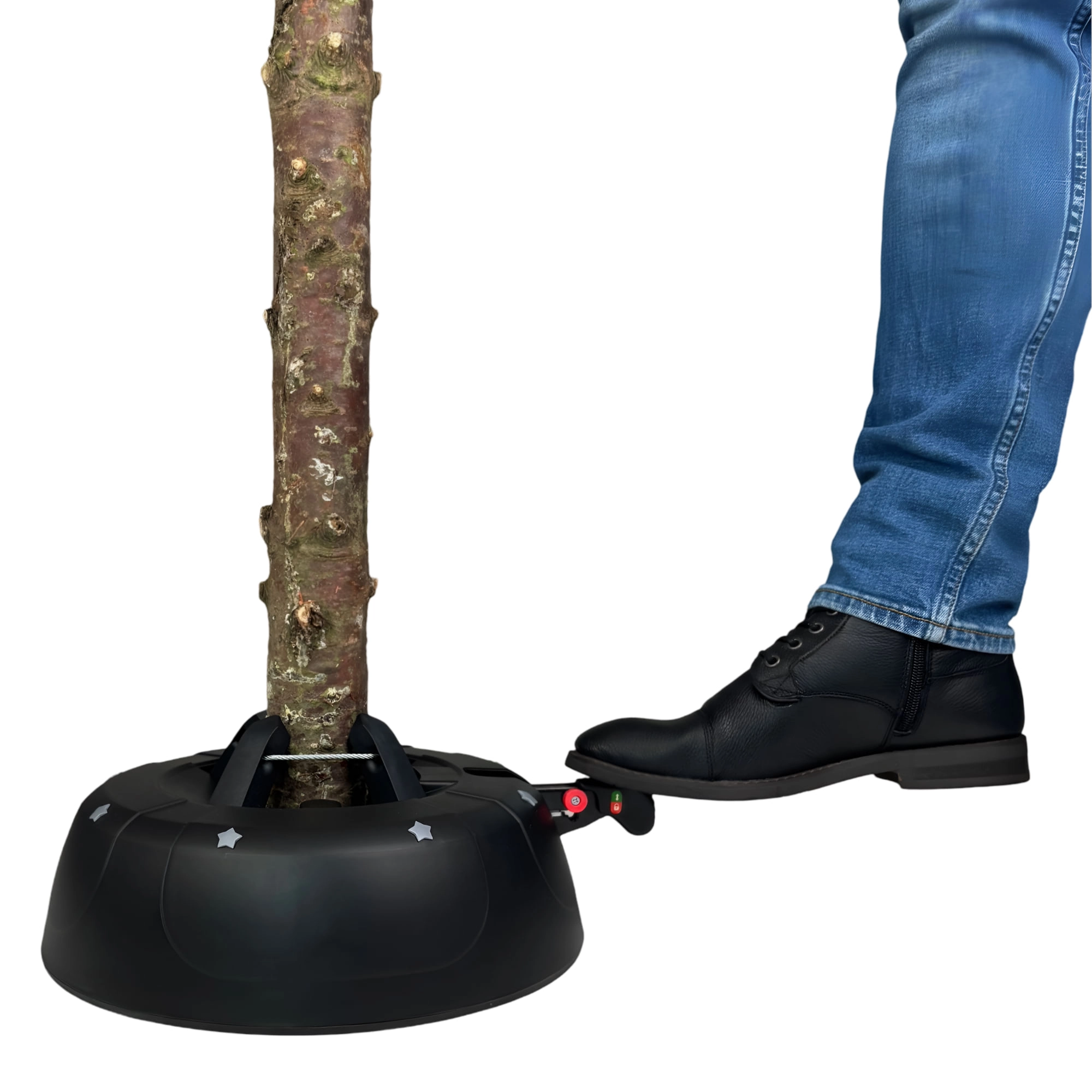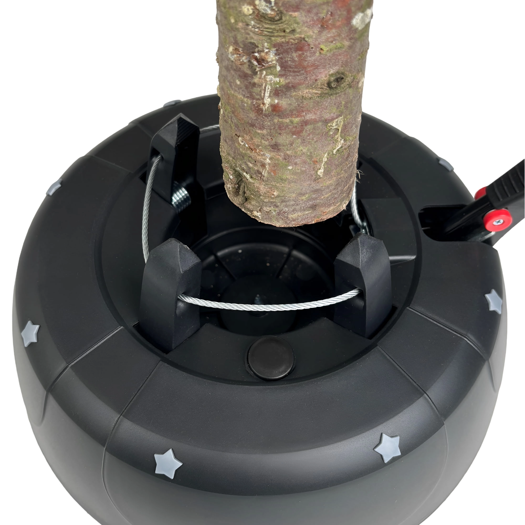 Het gepatenteerde systeem met vier haken van duurzaam staal klemt de stam met een diameter van 3–11 cm snel en stevig vast – zonder ingewikkeld schroeven.