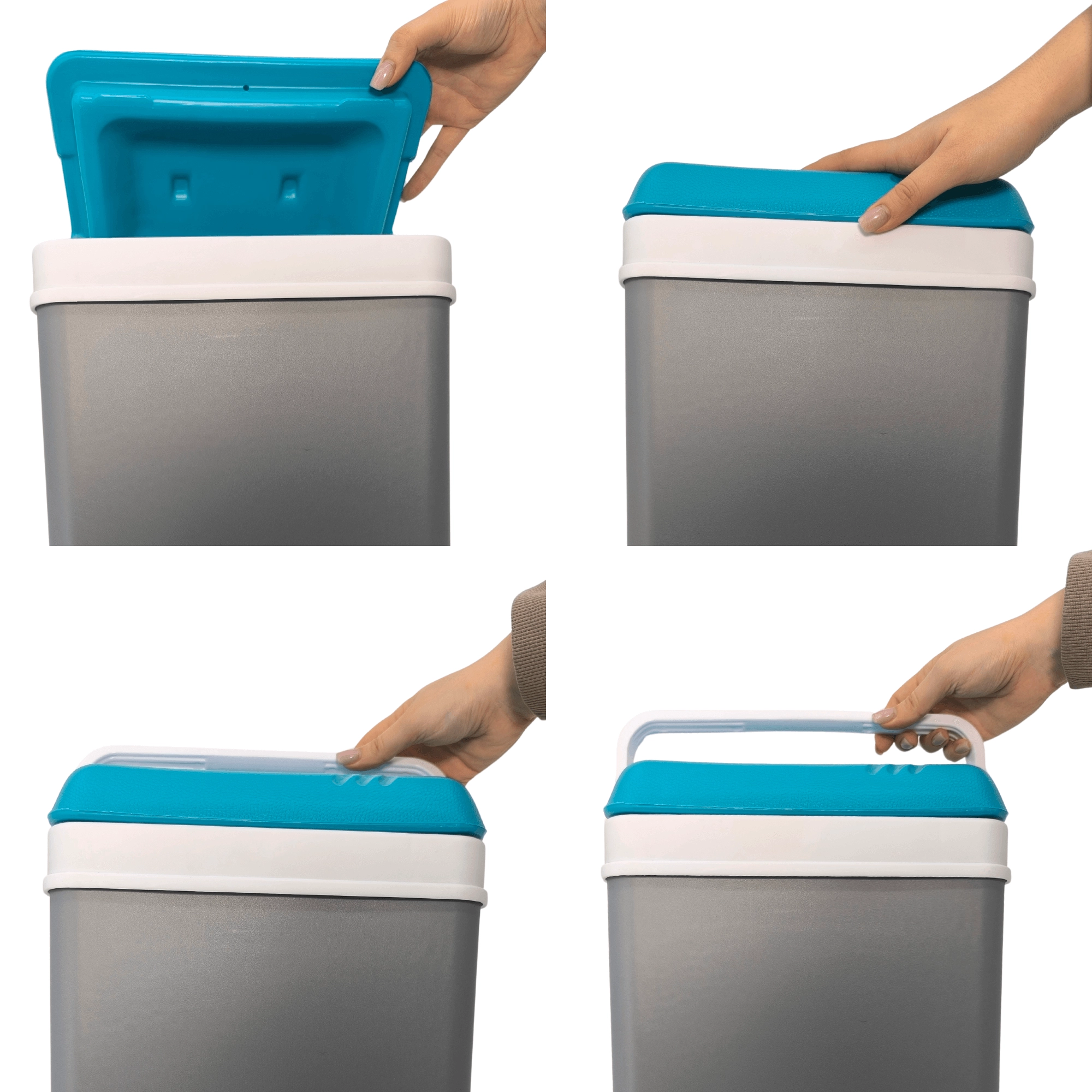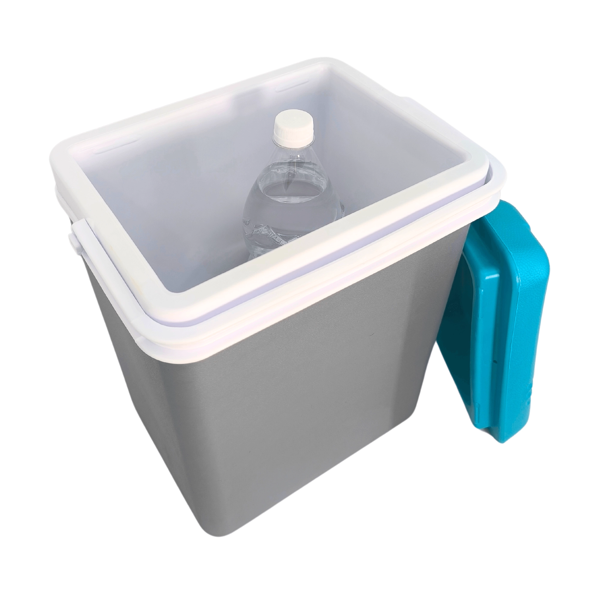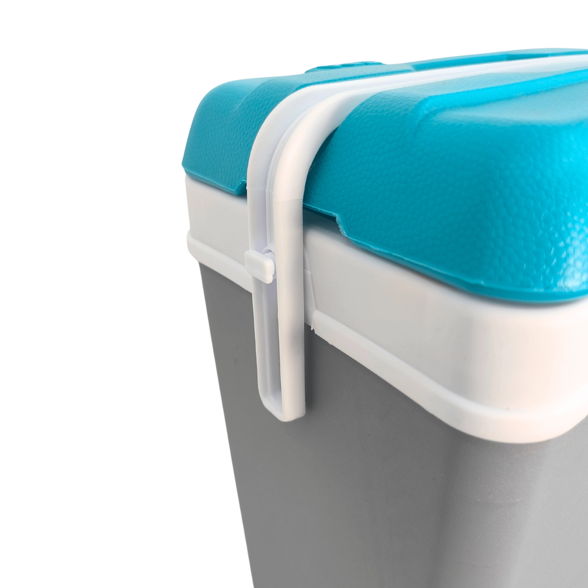 - Grijs met witte handgreep en turquoise deksel