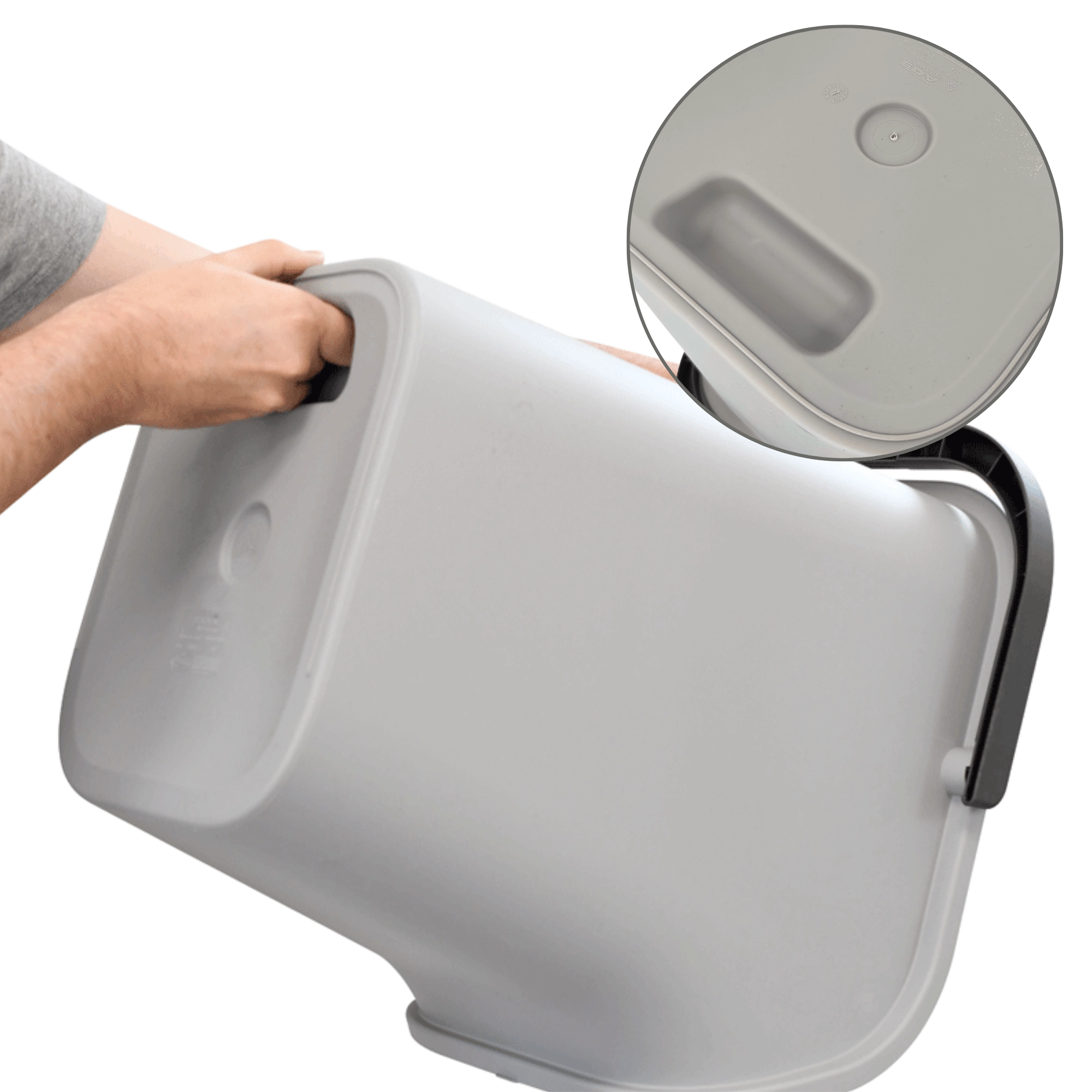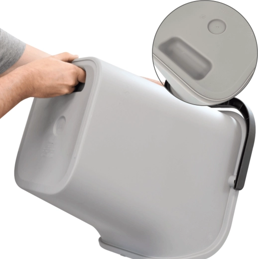 De stevige handgreep en de verzonken greep in het deksel maken eenvoudig dragen en veilig legen mogelijk, zonder morsen.