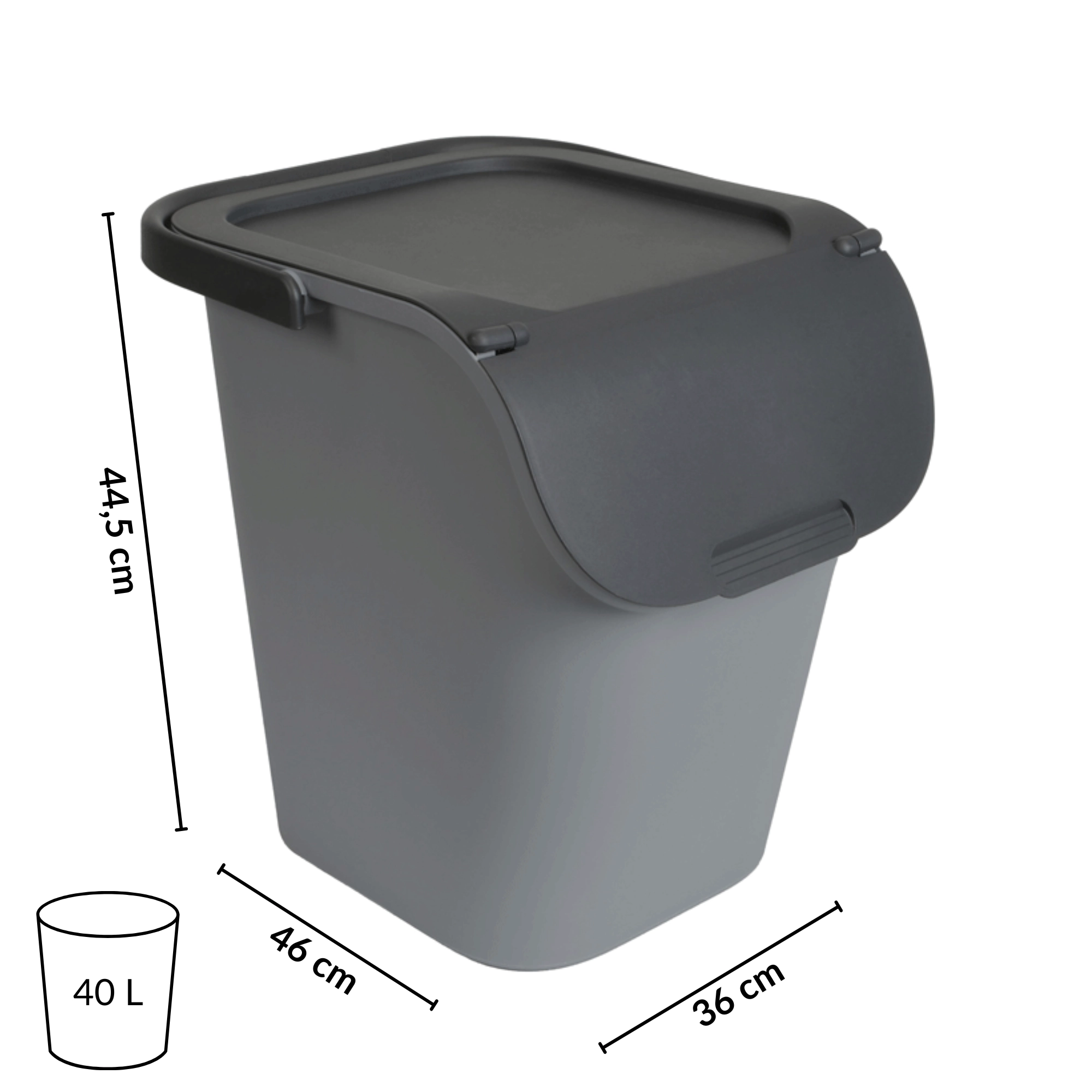 Een elegante en praktische afvalscheidingsbak van 40 l brengt orde én ecologie in huis. Dankzij de compacte rechthoekige vorm, het kanteldeksel en de stevige handgreep past hij perfect in keuken, voorraadkast en bijkeuken. Inclusief zelfklevende labels voor eenvoudige aanduiding van fracties – papier, glas, plastic en restafval.