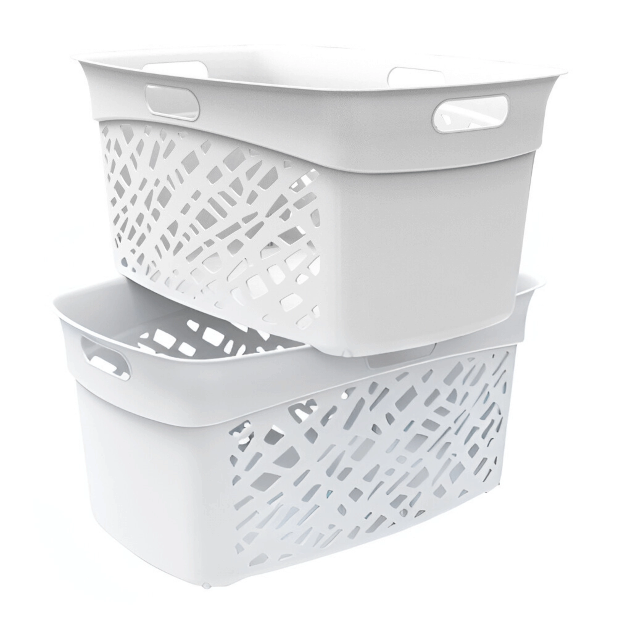 De speciale vorm maakt het mogelijk manden op elkaar te plaatsen. Ideale oplossing voor badkamers en wasruimtes met beperkte ruimte.