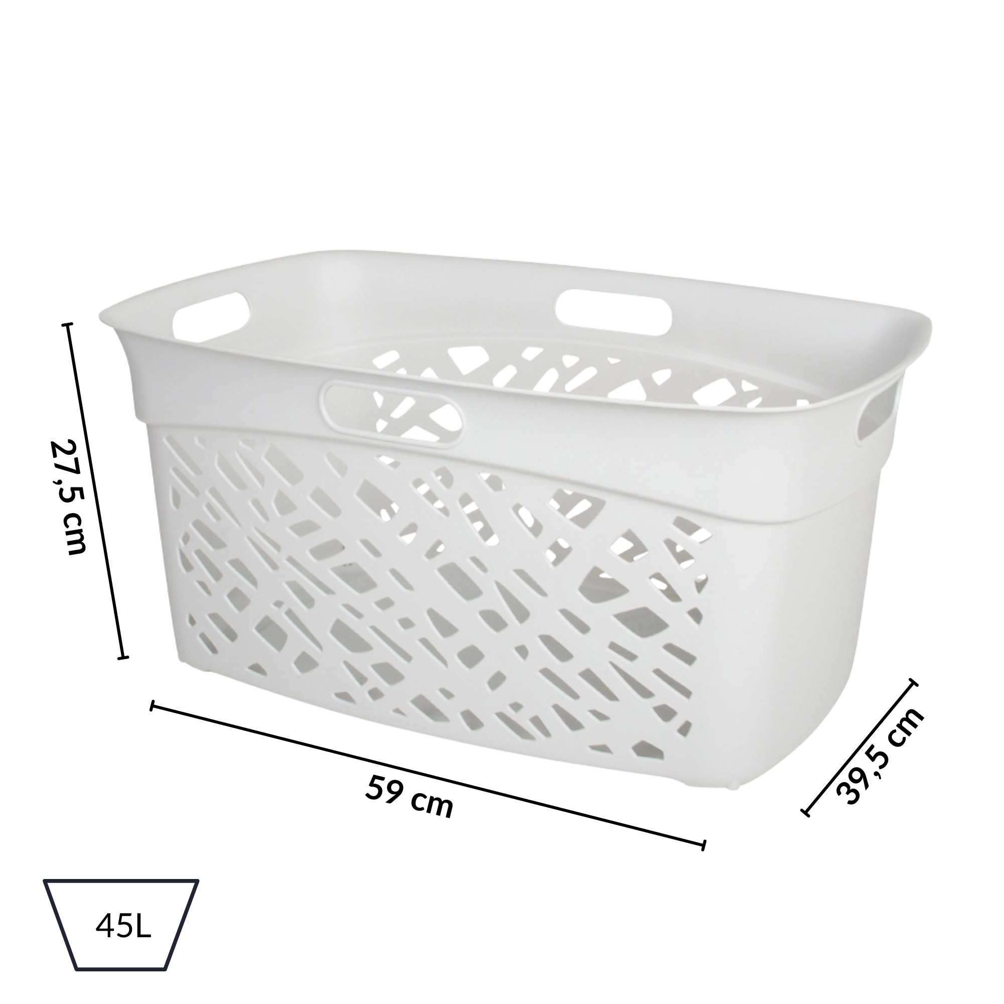 Dankzij de capaciteit van 45 liter, vier geïntegreerde handgrepen en een stevige rand is de mand comfortabel te dragen, zelfs onder volle belasting. De stapelbare constructie helpt ruimte te besparen in kleinere ruimtes; het materiaal van gerecycled plastic is duurzaam, licht en gemakkelijk te reinigen.