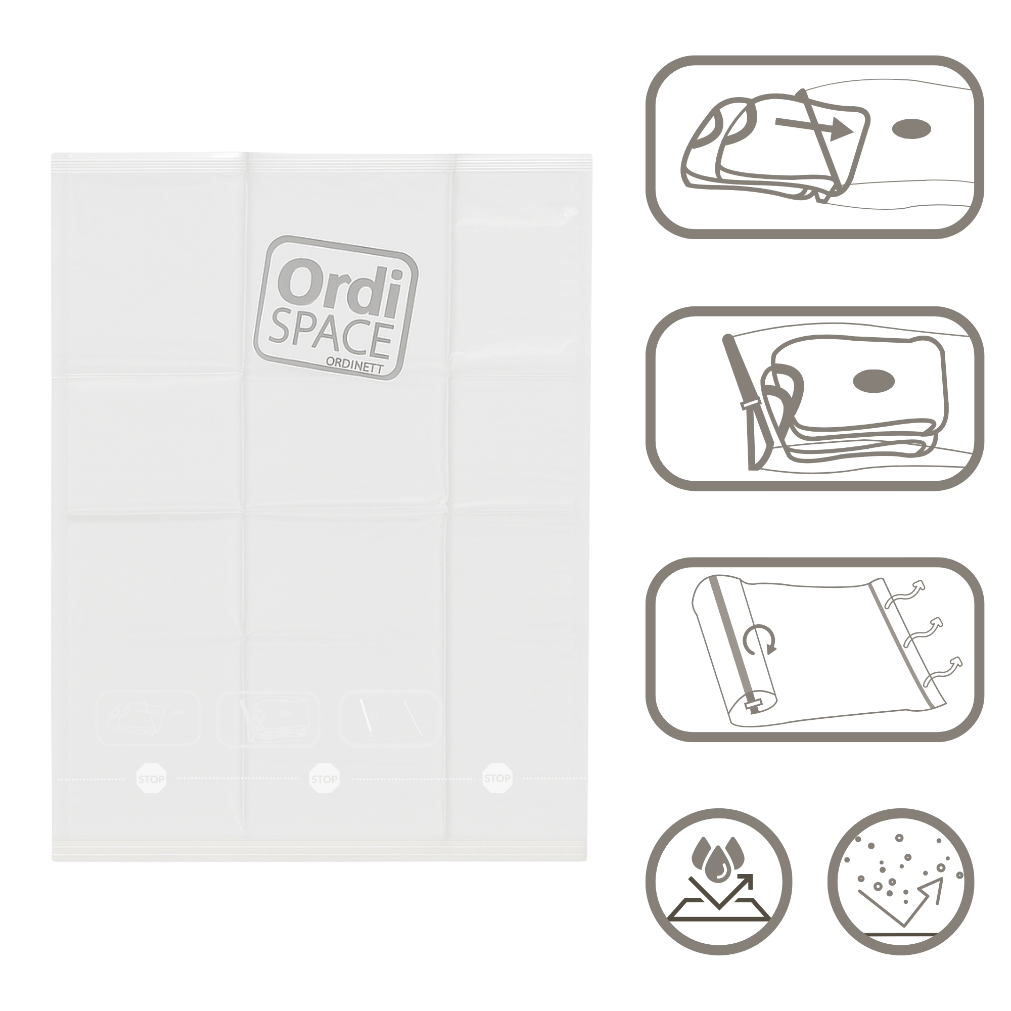 Praktische vacuümzak in maat M (42 × 50 cm) van duurzaam PE‑materiaal bespaart tot 75% ruimte. Dankzij het ontwerp zonder ventiel hoef je de zak alleen maar op te rollen om de lucht eruit te drukken, zonder stofzuiger. Hij is waterdicht, herbruikbaar en beschermt kleding betrouwbaar tegen stof, vocht en geurtjes – ideaal voor koffer, kast en thuisopslag.
