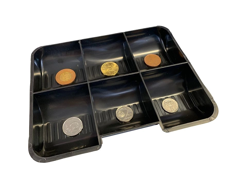 De uitneembare organizer houdt munten per denominatie gescheiden voor snel tellen en uitgeven.