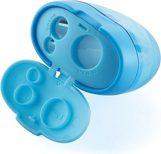 Praktische puntenslijper met een grote opvangbak en 3 gaten (8, 11 en 16 mm) voor gewone potloden, kleurpotloden en jumbo kleurpotloden. Biedt een schone werking zonder rommel dankzij de afsluitbare deksel en de compacte afmetingen voor eenvoudig meenemen.