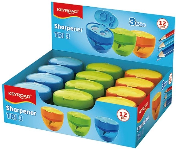 De Keyroad Tri Plus puntenslijper is een veelzijdige oplossing voor alle soorten schrijfwaren. Dankzij de drie openingdiameters (8 mm, 11 mm en 16 mm) slijpt u moeiteloos standaard potloden, klassieke kleurpotloden en dikke jumbo kleurpotloden. De geïntegreerde container met hoge capaciteit houdt het werkoppervlak netjes en het transparante deksel voorkomt ongewenst morsen van snippers.