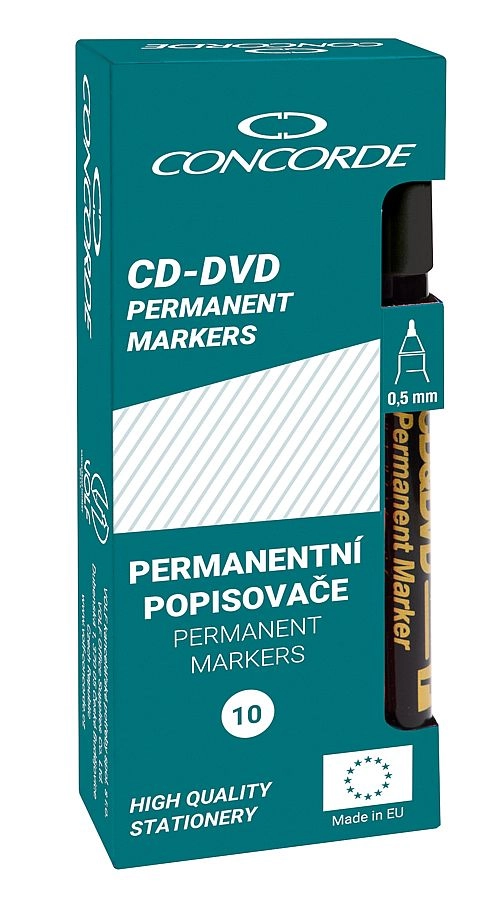 Universele permanente marker CONCORDE voor cd’s en dvd’s en andere gladde oppervlakken. Biedt sneldrogende alcoholinkt, is water- en veegbestendig en heeft een fijne lijn van 0,5 mm voor nauwkeurig en schoon schrijven.