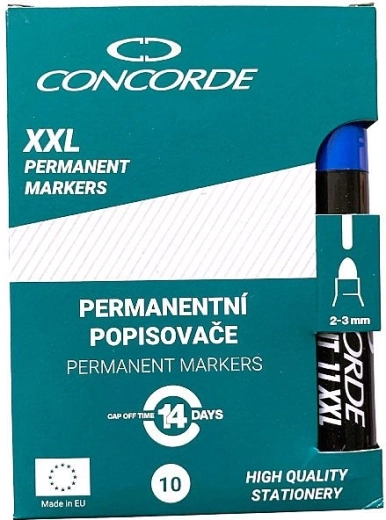 De permanente marker CONCORDE in blauwe kleur is een ideale keuze voor dagelijks markeren op kantoor, op school en in de werkplaats. De alcoholinkt creëert een diepe, dekkende lijn die uitstekend hecht op zowel gladde als poreuze oppervlakken en bestand is tegen water en vegen.