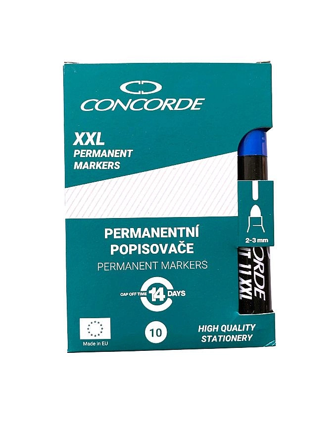 Universele permanente marker CONCORDE met alcoholinkt voor betrouwbare markering van folie, glas, plastic, hout en metaal. Biedt onuitwisbare en waterbestendige tekst, dekkende inkt en een comfortabele schrijfbreedte van 3 mm met ronde punt. Kan tot 14 dagen zonder dop zonder uit te drogen.