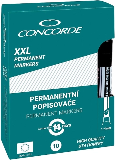 Universele permanente marker CONCORDE met dekkende inkt op alcoholbasis voor betrouwbaar markeren op folies, glas, kunststoffen, hout en metaal. Biedt een onuitwisbare en waterbestendige markering, ronde punt 3 mm en uitzonderlijke uithouding – tot 14 dagen zonder dop zonder uit te drogen.