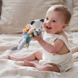 Dit lieve beertje combineert veiligheid, duurzaamheid en plezier. Bij het indrukken piept het zacht en bij beweging rammelt het, wat op natuurlijke wijze de ontwikkeling van de fijne motoriek, hand-oogcoördinatie en zintuiglijke prikkels vanaf de geboorte ondersteunt. De zachte uitvoering van GOTS-gecertificeerd biologisch katoen is vriendelijk voor de gevoelige babyhuid.
