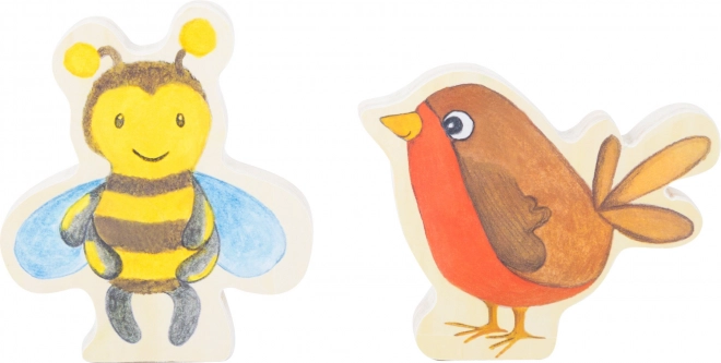 - Houten prentenboek + 2 houten figuurtjes (bijtje, vogeltje)