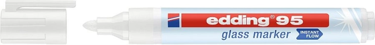 Praktische witte glasmarker EDDING 95 voor heldere en schone markeringen op alle glazen oppervlakken. Biedt uitstekende dekking, sneldroeiende inkt zonder vettige film en droog uitwisbaar. Ideaal voor glas, spiegels, glazen borden en whiteboards. Dop eraf en schrijven maar.