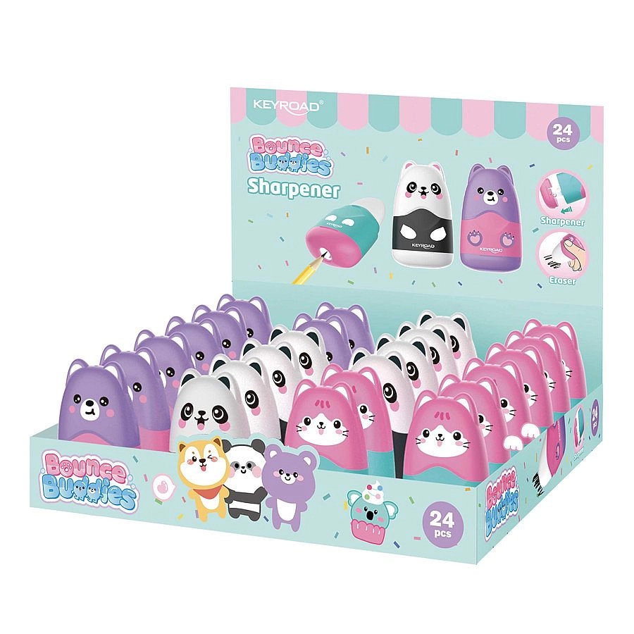 Vrolijke 2-in-1 puntenslijper met diermotief combineert een puntenslijper met opvangbakje en een gum met dop in één handig accessoire. Ideaal voor potloden en kleurpotloden van 8 mm, met een ergonomische vorm en compact formaat, past makkelijk in de etui en houdt alles schoon en overzichtelijk.
