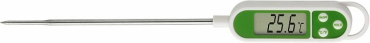 Praktische en nauwkeurige digitale insteekthermometer TFA in het groen, ideaal voor de snelle controle van de temperatuur van levensmiddelen en dranken – van bakken en babyvoeding tot wijn, olie of chocolademassa’s. Biedt een breed meetbereik van -50 tot +300 °C, een lange sonde van 140 mm en voldoet aan de HACCP-norm voor voedselveiligheid. De functie voor automatisch uitschakelen bespaart batterijvermogen.