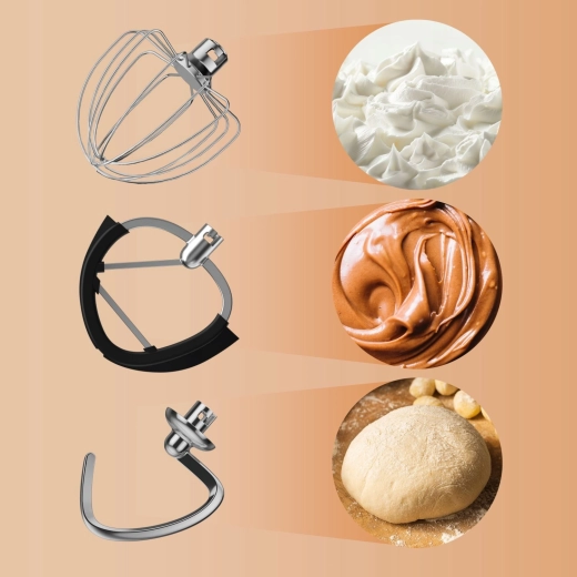De 2000 W motor in combinatie met planetaire mengbeweging verwerkt zowel luchtige crèmes als stevige gerezen deegsoorten met professionele resultaten.