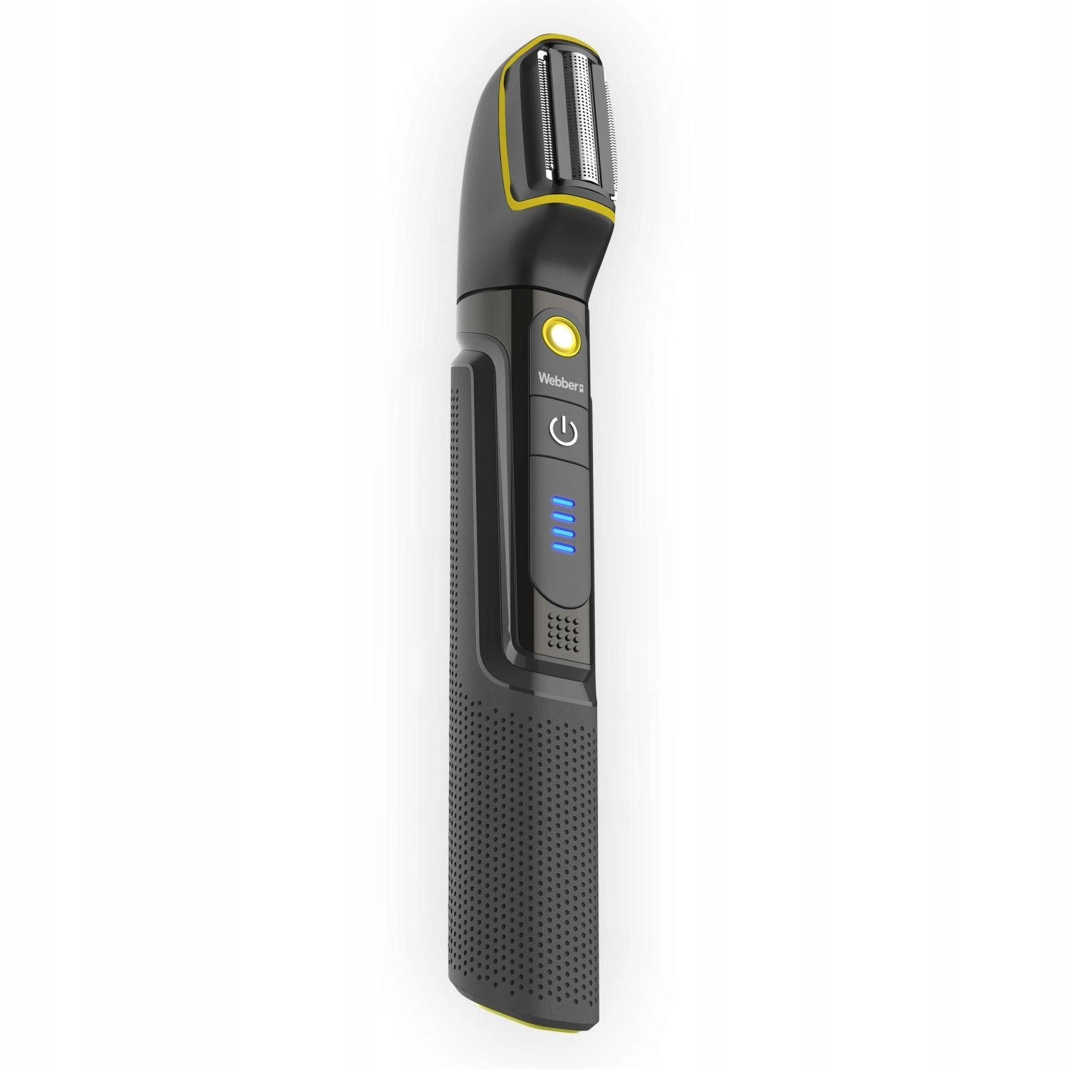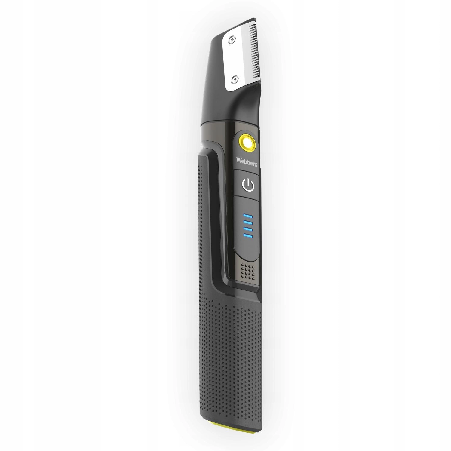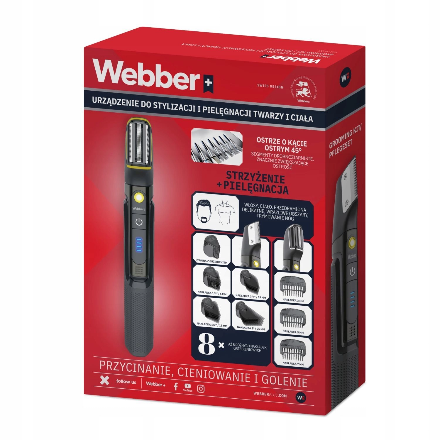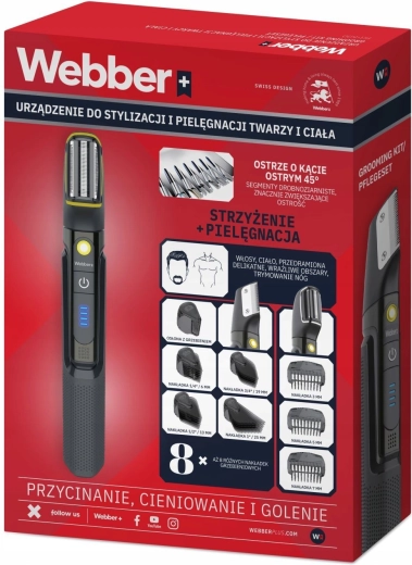 Universele trimmer WEBBER BG-600 voor dagelijkse verzorging van baard, haar en lichaam. Biedt 8-in-1 uitrusting, precisie 45° stalen messen, natte en droge werking (IPX7), 500 mAh batterij met een gebruiksduur tot 90 minuten, bereik 3–25 mm en een overzichtelijk LED-display.