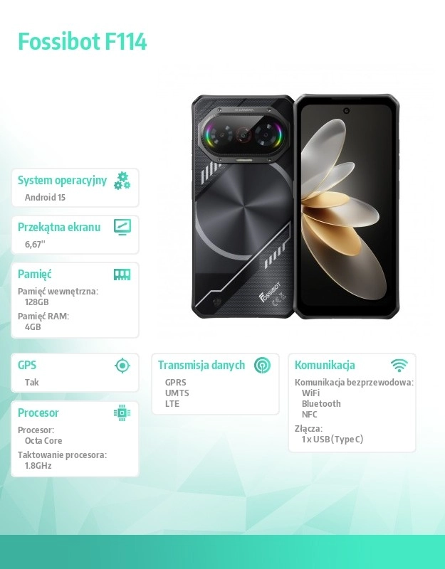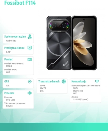 De FOSSiBOT F114 is een duurzame smartphone met een verstevigde behuizing, een moderne punch‑hole display en een meervoudige AI‑camera. Hij biedt betrouwbaarheid in veeleisende omstandigheden, een getextureerde grip en snelle toegang via de zijknop, ideaal voor werk, avontuur en dagelijks gebruik.