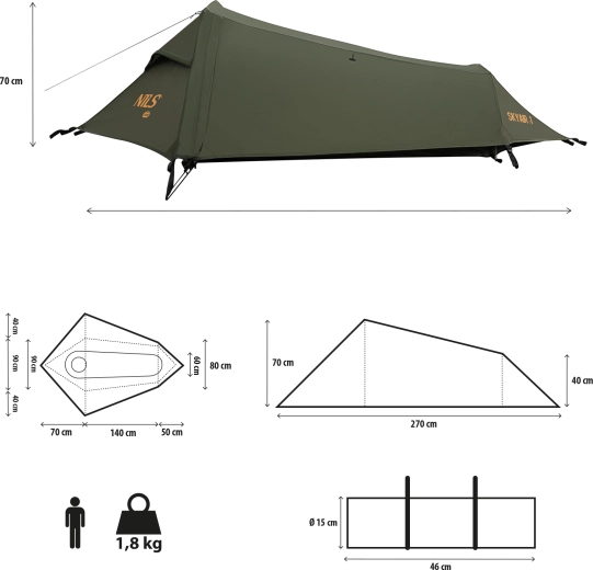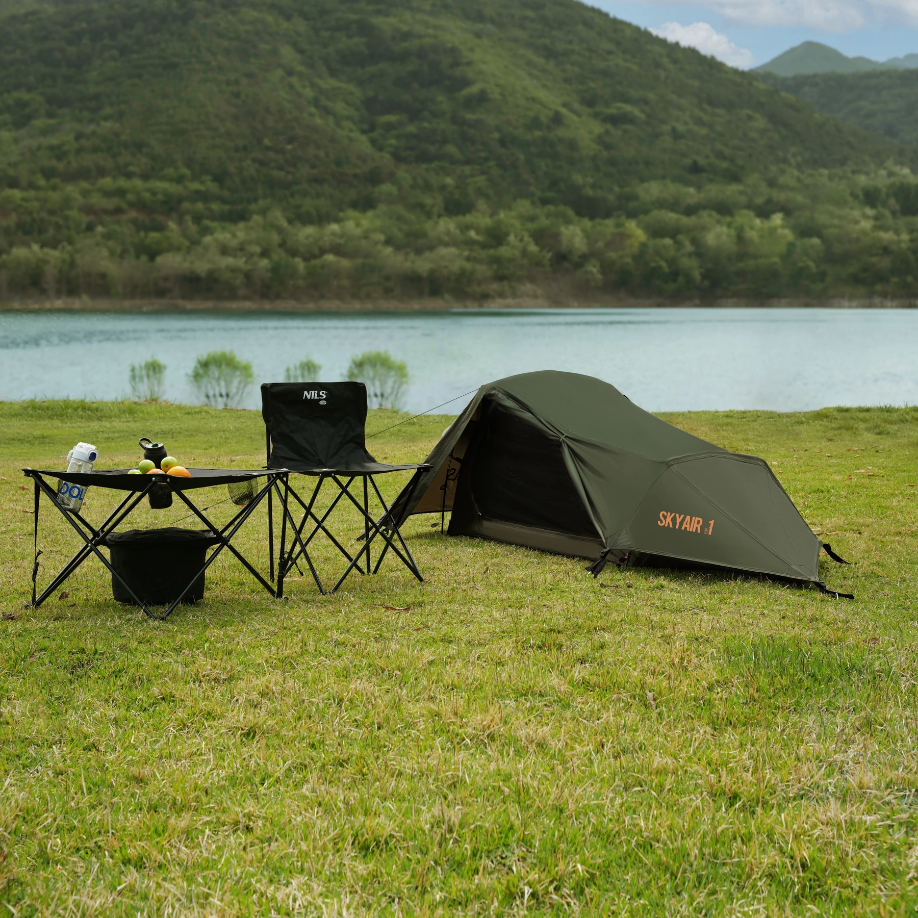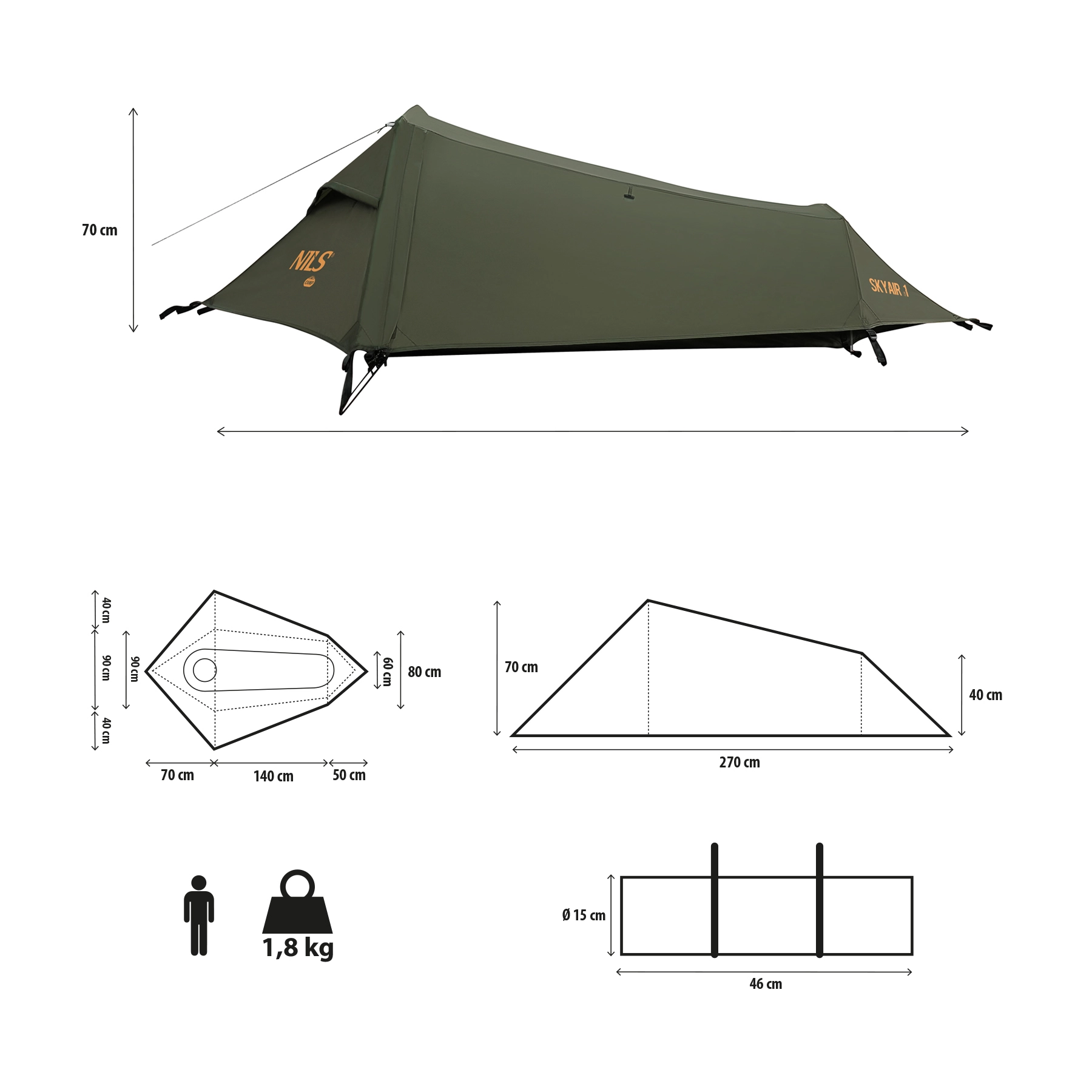 De NILS CAMP Skyair 1 is ontworpen voor solo-tochten waarbij elk gram telt én ongestoord slaapcomfort belangrijk is. De aerodynamische, lage constructie met duurzame buitentent van 190T en getapete naden beschermt betrouwbaar tegen slecht weer, terwijl de ademende binnentent met dicht B3-muskietengaas zorgt voor een rustige nacht zonder hinderlijke insecten.