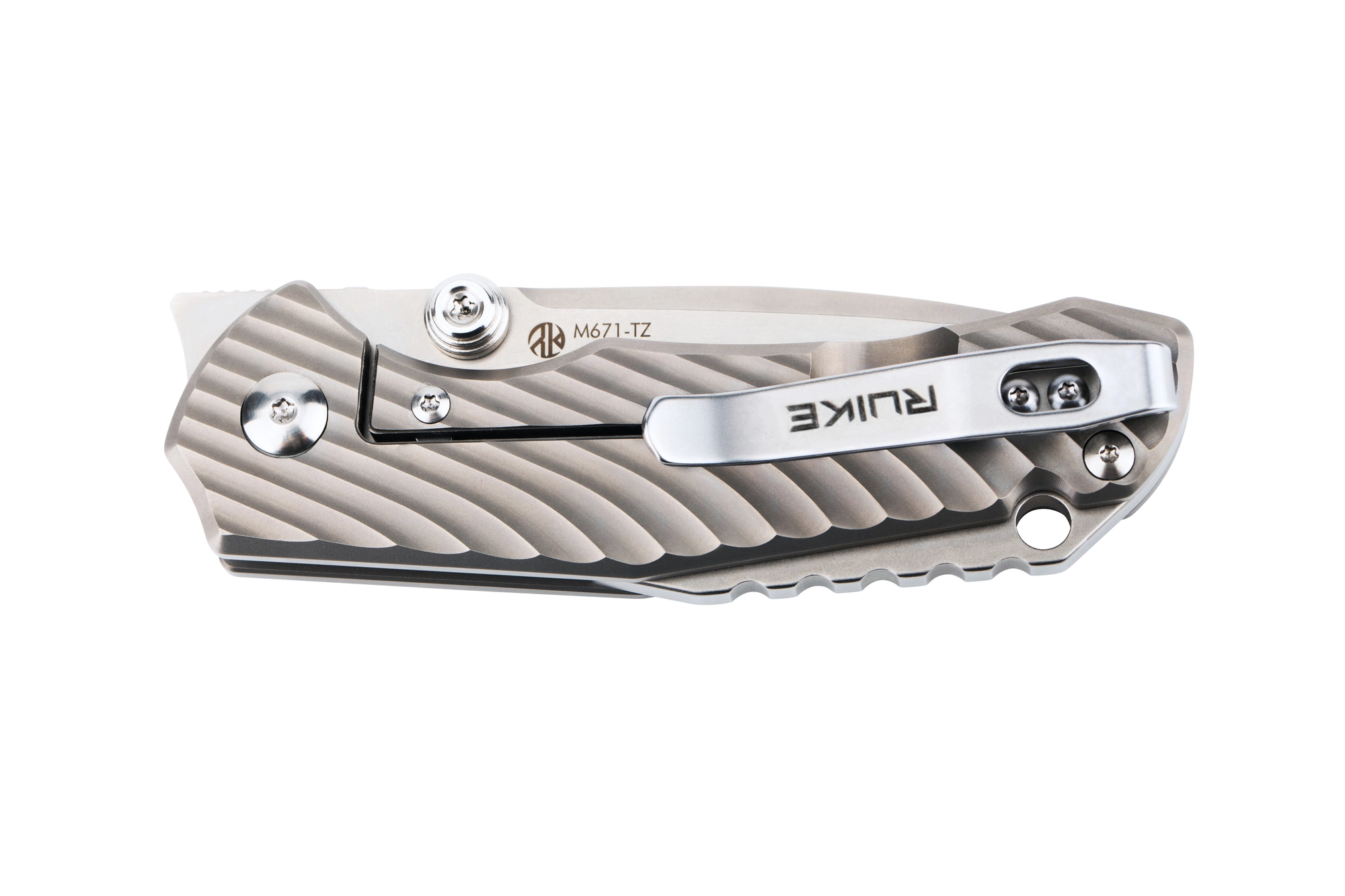 Compact EDC-mes Ruike M671-TZ met een lemmet van 7 cm uit 154CM staal en een Bead Blasted afwerking. Biedt soepel openen op kogellagers, keuze tussen Front Flipper en dubbelzijdige duimpin, en een veilige vergrendeling met Framelock. De lichte TC4 titanium handgreep met textuur, clip en koordoog garandeert comfortabel en betrouwbaar dagelijks dragen.