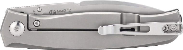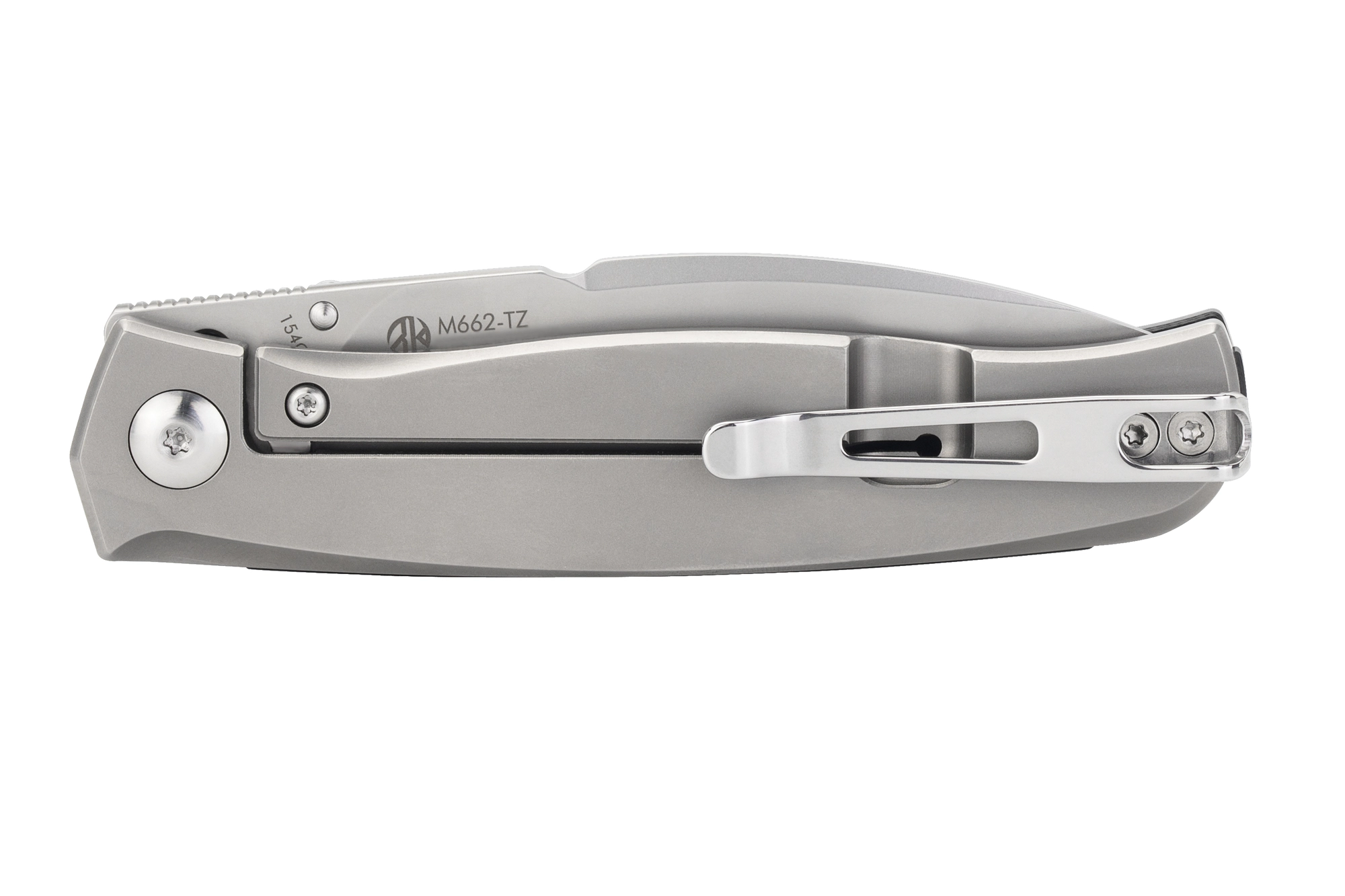 Openen gaat vloeiend dankzij kogellagers en de dubbelzijdige duimpin – geschikt voor zowel rechts- als linkshandigen. De robuuste Framelock-vergrendeling in het titanium frame zorgt voor veilig werken. De voorkant van de greep van G10 met antisliptextuur biedt een zekere grip, terwijl de achterkant van titanium T4 het gewicht verlaagt en de stijfheid van de constructie verhoogt. De draagclip maakt comfortabel en discreet dragen mogelijk.