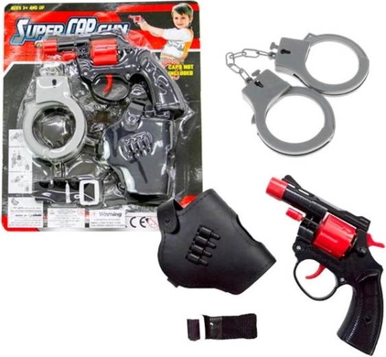 Leuke set voor kleine agenten: een capsulepistool met handboeien en holster. Ideaal voor politie-en-boef rollenspellen, biedt veilige, actievolle pret, eenvoudige bediening en realistische accessoires voor een nog intensere speelervaring.
