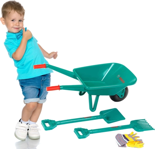 Deze realistische BOSCH tuinset voor kinderen bootst echt gereedschap na en motiveert kleine helpers om actief buiten te bewegen. Het lichte ontwerp, de comfortabele grepen en de stabiele kruiwagen met één wiel maken duwen en manoeuvreren gemakkelijk.