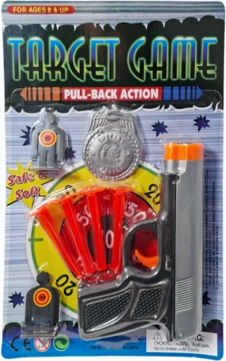 Geniet van actievolle fun met een complete set voor richttraining. Het lichte pistool schiet zachte schuimpijltjes af, waardoor het spel leuk en veilig is. De doelschijf met puntentelling knip je eenvoudig uit de verpakking en je kunt meteen beginnen te strijden om de hoogste score. Er is ook een politie-insigne inbegrepen voor een nog intensere spelbeleving.