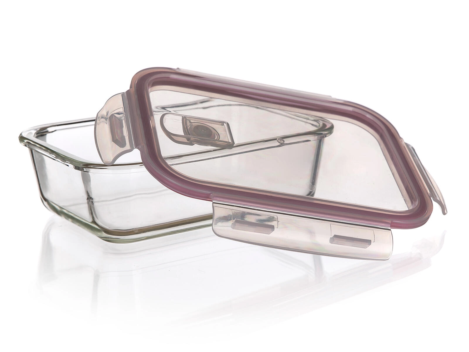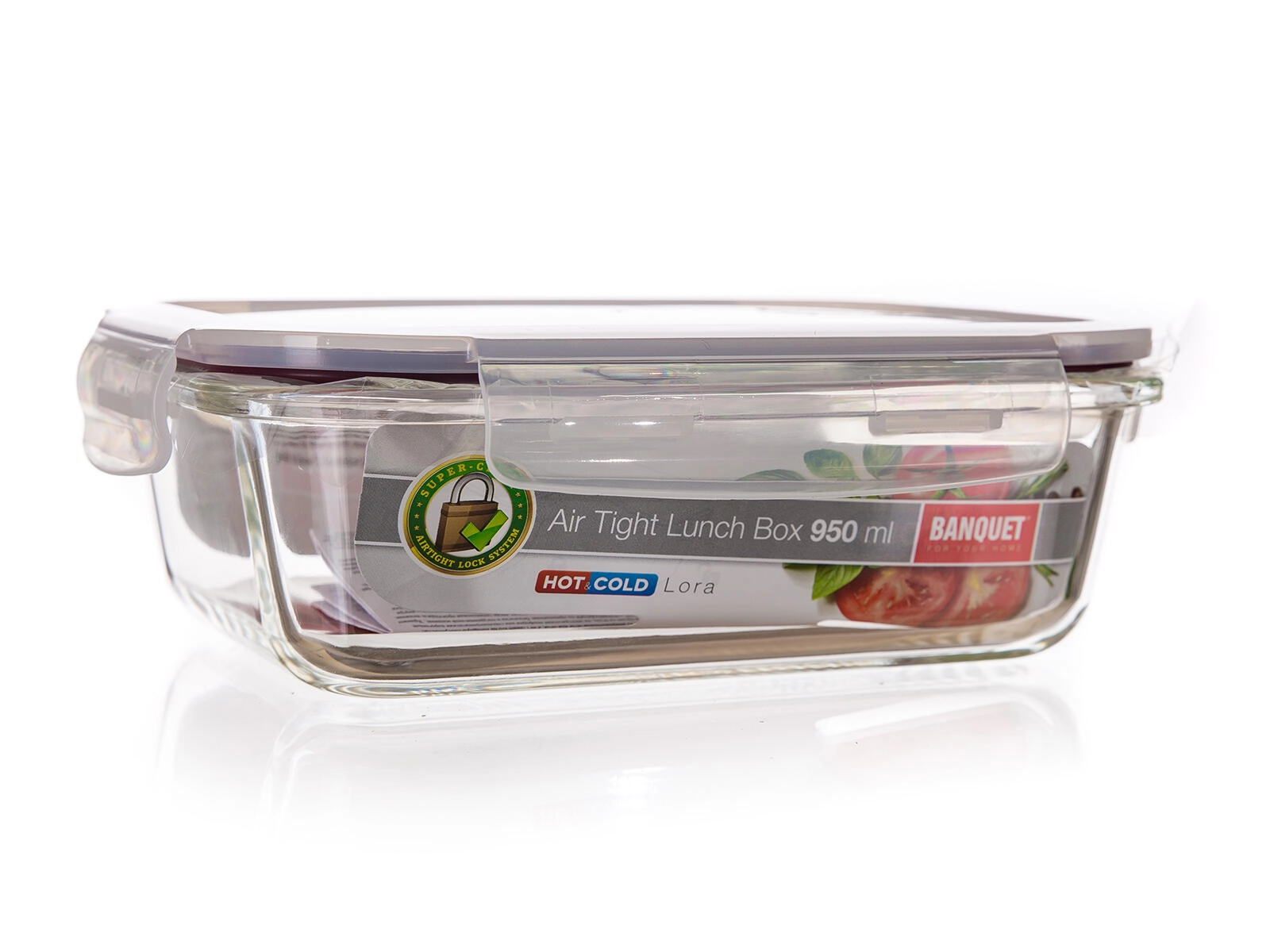 Praktische glazen Lora-doos met een inhoud van 0,95 l voor dagelijks bewaren van maaltijden. Biedt hermetische afsluiting, een lekvrij deksel met klemmen en veelzijdig gebruik – voor koelkast, vriezer en oven zonder deksel. Ideaal voor meal prep, het meenemen van lunch en het bewaren van restjes.