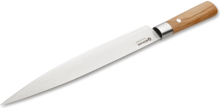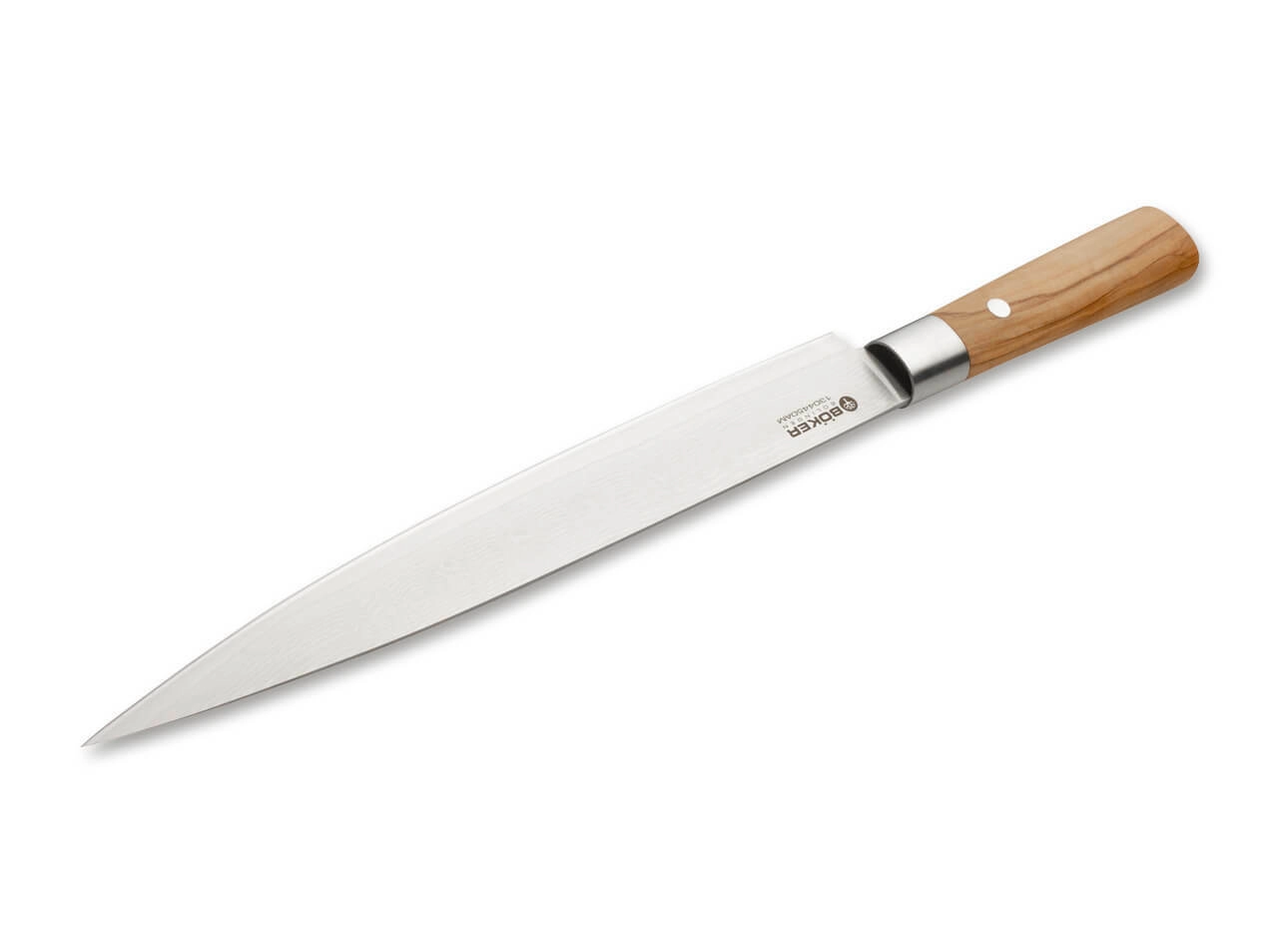 Het Böker Manufaktur Solingen Damascus Olive trancheermes is ontworpen voor precies en soepel snijden van dunne plakjes en blokjes. Het lange, slanke lemmet van meerlaags damaststaal biedt uitstekende controle tijdens het snijden en minimaliseert het scheuren van vezels van vlees en vis.