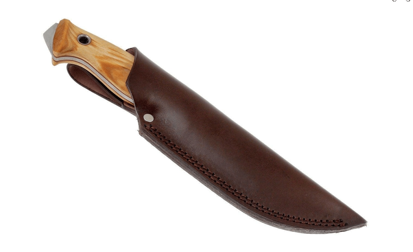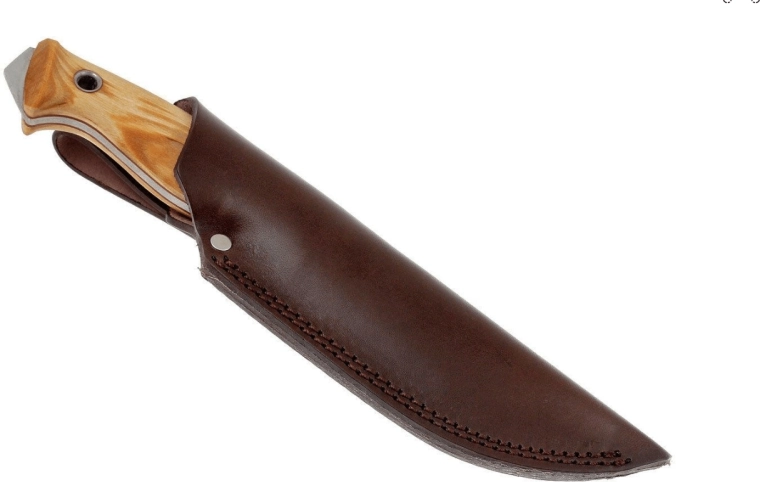 De full-tang constructie zorgt voor uitzonderlijke sterkte en stabiliteit bij veeleisend werk. Het handvat uit één stuk krullend berkenhout is met de hand geslepen, gepolijst en geolied, ligt prachtig in de hand en biedt een unieke natuurlijke uitstraling. Het leren etui maakt veilig en stijlvol dragen aan de riem mogelijk.