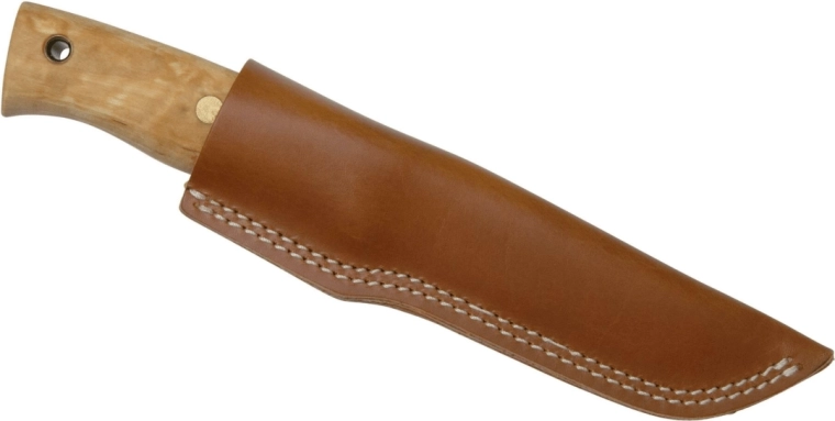 De handgreep uit één stuk gevlamd berkenhout is met de hand geslepen, gepolijst en geolied, ligt uitstekend in de hand en elk exemplaar heeft een unieke uitstraling. Inbegrepen is een hoogwaardige leren schede voor veilig en comfortabel dragen aan de riem.