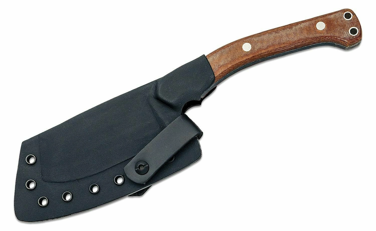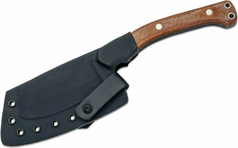 De ergonomische handgreep van Micarta in bruin ligt uitstekend in de hand, ook nat, en twee doorlopende koordgaten maken het bevestigen van een koord mogelijk voor extra veiligheid. Het mes wordt geleverd met een stevige thermoplastische schede en een leren riemhouder, zodat het altijd binnen handbereik is.