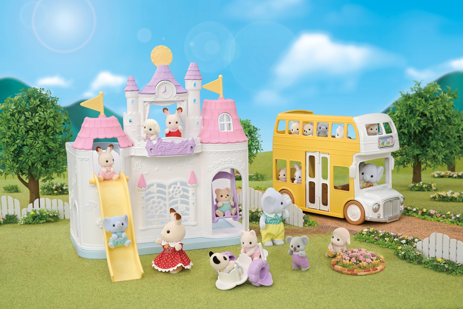 - Kasteelkleuterschool (speelkasteel), glijbaan, schommel, wip (om te bouwen tot tafel en stoeltjes), interieuraccessoires, babyfiguur Flora Konijntje