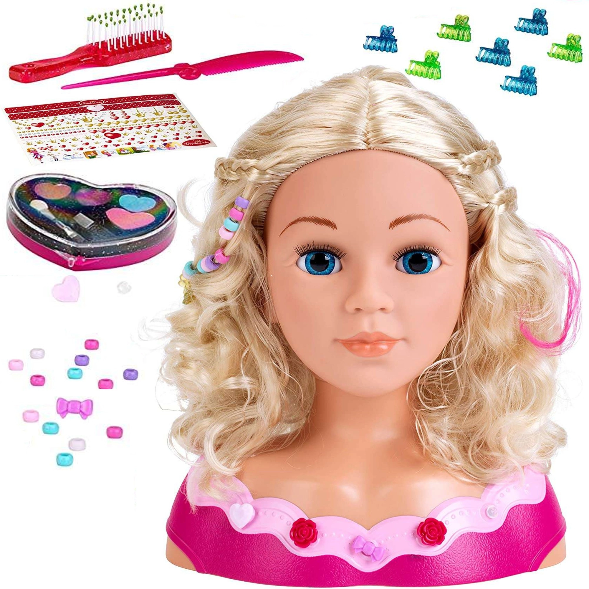 Borstel, kam, clips, kralen, sierlokken en meer accessoires. Complete uitrusting voor uren creatieve pret en het leren van nieuwe kapseltechnieken.