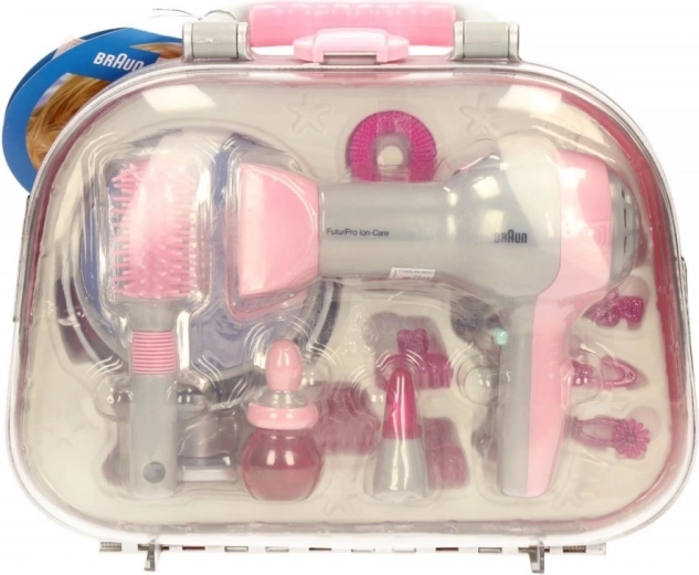 Maak uw kind blij met het kappersset van Braun, dat een spiegeltje, föhn, borstel, kam en andere essentiële accessoires in een elegante koffer bevat.