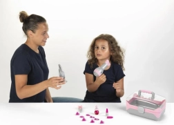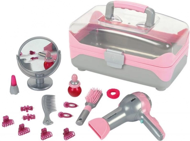 De set is gelicentieerd door Braun en verpakt in een stijlvolle koffer met transparant deksel voor gemakkelijke opslag en orde. De koffer is gemaakt van hoogwaardig plastic, heeft een ergonomische handgreep en een sluiting die het gesloten houdt. Alle apparaten komen overeen met echte Braun FuturPro Ion-Care producten en de föhn is uitgerust met een opzetstuk voor haarversteviging. Het is de perfecte set voor de veeleisende, professionele kleine kapster.