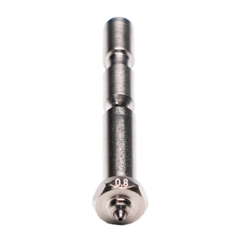 Dankzij de grotere nozzlediameter bereikt u een hogere doorvoer, ideaal voor snel printen, grotere prints en materialen die een intensievere dosering vereisen. Roestvrij staal biedt bovendien een hogere slijtvastheid dan messing, wat resulteert in een langere levensduur en consistentere laagkwaliteit.